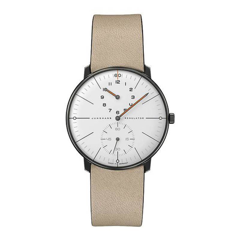 A la fois sobre et original, le cadran qui se dévoile au cœur de votre poignet vous offre un affichage analogique de l'heure lumineux. Son fond blanc fait ressortir des indicateurs temporels oranges et gris foncés. Au centre, l'aiguille orangée indiquera les minutes en parcourant des index bâtons et un chemin de fer situés sur le pourtour du cadran. Le marqueur de midi se voit accompagné des minutes en chiffres arabes, dont le nombre "60" rappelle l'anniversaire des montres Max Bill. La petite aiguille orange se tient au centre du compteur placé dans la partie supérieure du cadran pour préciser les heures à l'aide d'index en chiffres arabes. Le traitement luminescent des deux aiguilles principales et de l'index de midi est une substance lumineuse responsable de l'environnement. Enfin, le compteur qui loge dans la partie inférieure du cadran indiquera les petites secondes. Au centre du cadran, à l'horizontale, la Maison appose sa signature et ajoute l'origine de fabrication allemande de chaque coté de l'index de 6h.