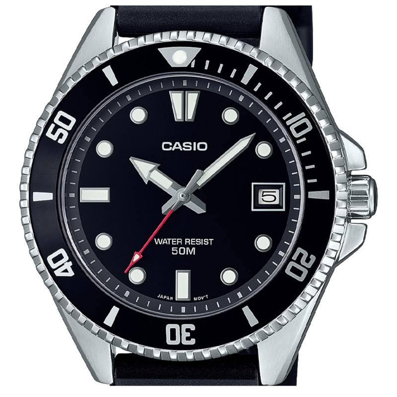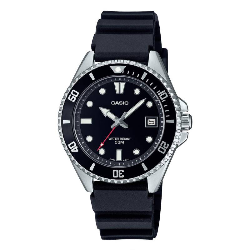 Cette montre se pare d'un cadran à la forme arrondie arborant un fond noir soleillée. Il apporte à ce garde-temps une touche d'élégance et s'harmonise parfaitement avec le modèle. Son centre abrite deux aiguilles argentées recouvertes d'un revêtement néobrite pour vous accorder une bonne lisibilité dans les milieux obscurs. Elles vous indiqueront les heures par celle au bout fléché et les minutes par celle au bout pointu. La fine trotteuse de couleur rouge, quant à elle, vous communiquera les secondes. Sur le pourtour de ce cadran, sont disposés un chemin de fer des minutes et des index luminescents qui faciliteront la lecture temporelle. Par ailleurs, la date vous sera communiquée via le guichet qui prend place à 3 heures. Pour finir, Casio signe sa création avec son nom à midi.