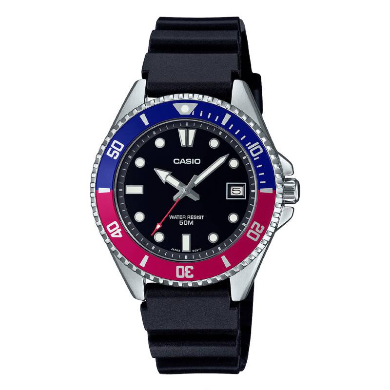 Casio est une marque internationale qui a connu un grand succès grâce à la fabrication de calculatrices. En faisant preuve d'innovation et de performance, elle propose depuis plusieurs années des garde-temps d'exception doté de multiples fonctionnalités réalisés par des professionnels au Japon. La Casio Collection présente ce superbe garde-temps au boîtier fabriqué en acier inoxydable de couleur argentée. De forme ronde, il a pour dimensions 42 mm de longueur, 38,50 mm de diamètre et dispose d'une épaisseur de 10,40 mm. Ce dernier est entouré par une lunette crantée bleu et rouge marquée par un marqueur luminescent. Il dispose d'un chemin de fer des minutes et tourne dans un sens repère luminescent et un chemin de fer des minutes. Tournant dans le sens anti-horaire, elle vous permettra de calculer le temps écoulé. La surface de ce boîtier de 58 grammes est recouverte par un verre minéral plat qui vous donnera une vue d'ensemble sur le cadran et vous trouverez à 3 heures une couronne crantée qui favorisera le réglage des différentes fonctions. Cette montre dispose d'un fond vissé qui assure une étanchéité de 5 ATM.