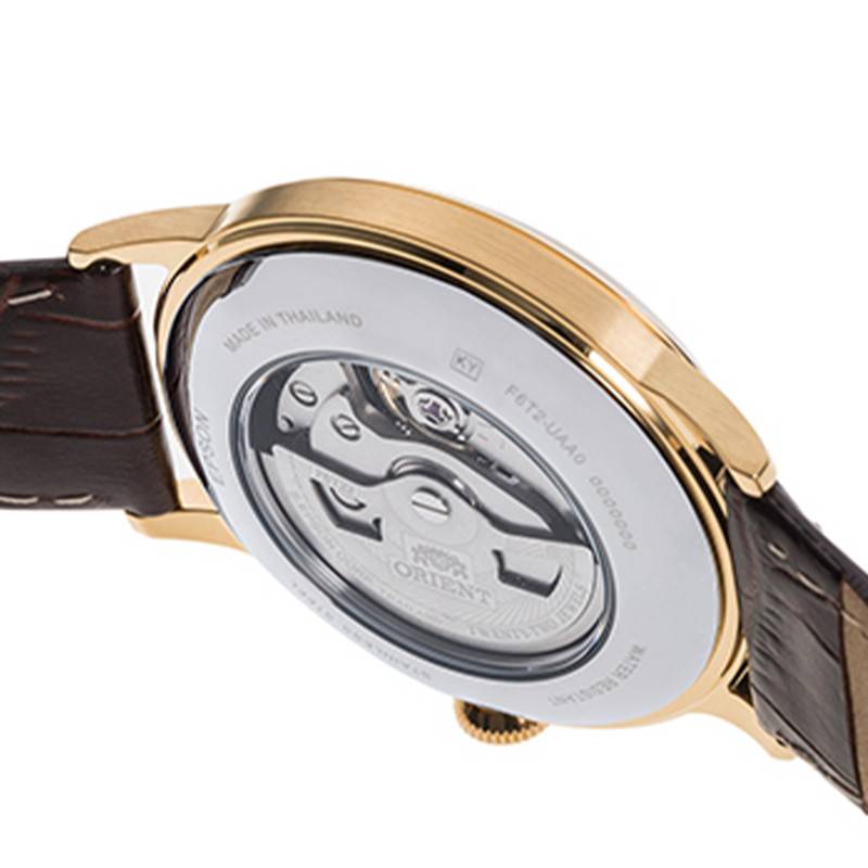 Symbole de sensibilité et de sophistication, la maison Orient nous dévoile cette pièce horlogère aussi performante qu'élégante. Grâce à sa finesse technique et son indéniable harmonie, cette pièce horlogère se mariera avec adresse à toutes vos tenues. Ses détails dorés (aiguilles, index) sur le cadran blanc soleillé donnent une impression de luminosité éclatante. Que vous alliez au bureau ou boire un café avec des proches, cette combinaison blanche et dorée vous conviendra à merveille. En acier inoxydable avec traitement PVD Or Jaune et d'un diamètre contenu de 40,5 millimètres, le boitier est muni d'un verre minéral, afin d'offrir une protection contre les rayures et chocs imprévus du quotidien. Vous pourrez vous promettre d'agréables pauses lyriques et imaginatives en contemplant le magnifique cadran "à coeur ouvert" de la montre. La couronne, dorée et installée à 3 heures, vous permettra de remonter manuellement le mouvement de la montre ou tout simplement de la mettre à la bonne heure. Enfin, le fond en acier du boîtier est emboité mais également transparent. Cette transparence vous donnera l'occasion de réveiller l'horloger qui sommeil en vous en examinant le travail minutieux de la maison Orient sur la masse oscillante en mouvement.
