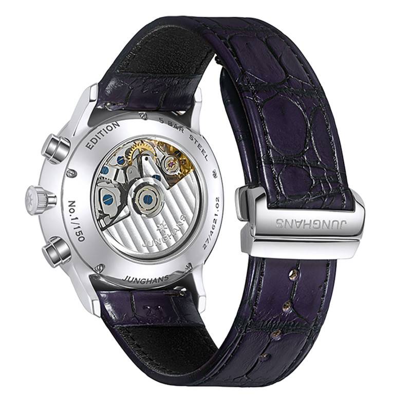 Le bracelet de cette Junghans Meister Chronoscope magnifie le thème de l'élégance avec son design intemporel et somptueux. Fabriqué en cuir d'alligator véritable, il arbore un somptueux violet qui complète parfaitement le dégradé du cadran. Les surpiqûres délicates ajoutent une touche d'artisanat raffiné à l'ensemble. Le fermoir boucle déployante garantit une sécurité et un confort inégalés, combinant sophistication et praticité avec une aisance certaine.