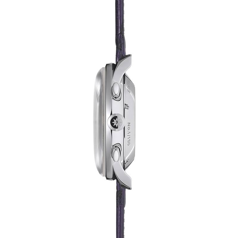 La Junghans Meister Chronoscope se révèle être un garde-temps d'exception, conçu pour l'homme moderne à la recherche de sophistication et de performance. Le boîtier rond de cette montre est fabriqué en acier inoxydable de haute qualité, garantissant une durabilité et une résistance à toute épreuve. Avec un diamètre impressionnant de 40,70 mm et une épaisseur de 13,90 mm, elle se positionne sobrement et élégamment sur le poignet. Le fond de la boîte est magnifiquement transparent, maintenu par des vis solides, permettant une vue captivante sur le cœur de la montre. Ce design précis est renforcé par un verre saphir bombé qui offre une protection supérieure tout en permettant une vue non obstruée grâce à un double traitement antireflets. Cette pièce, fabriquée en Allemagne, bénéficie d'une garantie internationale de 2 ans, attestant de sa qualité et de la confiance que la marque place dans son savoir-faire exceptionnel. Limitée à 150 exemplaires, l'extravagante édition 2026 se pare d'un violet profond, d'un bracelet en alligator et d'une boucle déployante.