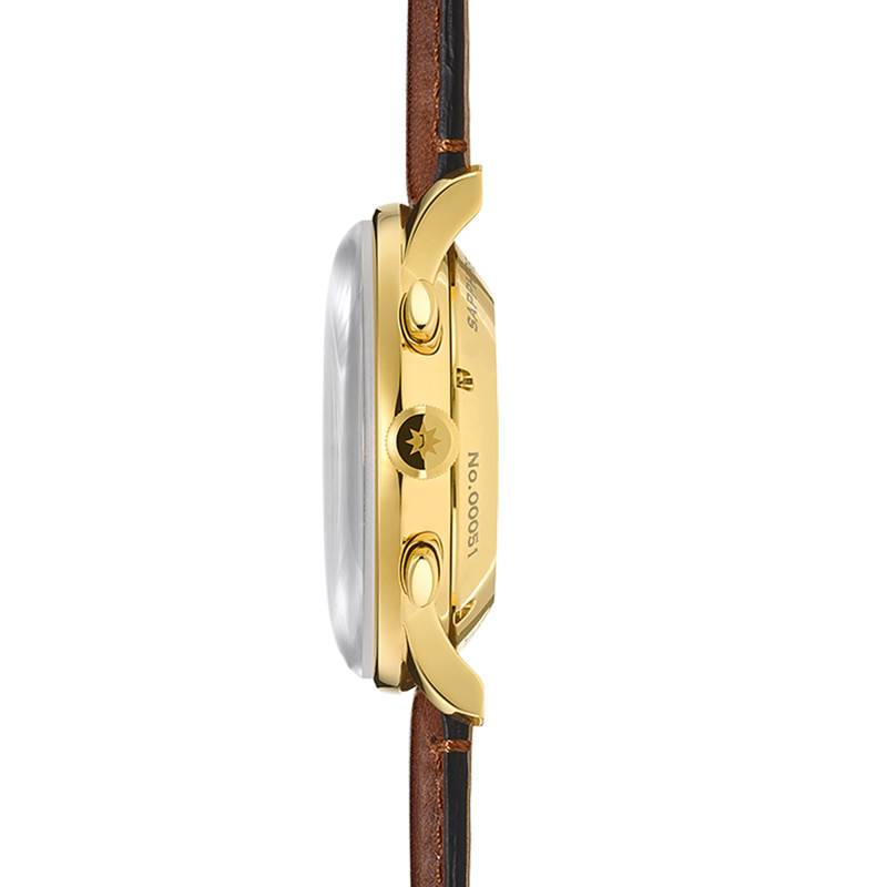 Le bracelet en cuir de cheval marron de cette montre évoque une élégance intemporelle avec sa surpiqûre soignée, qui apporte une touche de distinction et de raffinement à l'ensemble. La matière sélectionnée offre non seulement un confort exceptionnel au poignet, mais aussi une longévité admirable, résistant aux usures du temps. Sa fermeture par boucle déployante assure une praticité et une sécurité optimales, facilitant son ajustement et augmentant la longévité du bracelet en prévenant les étirements non désirés. Le cadran blanc, souligné par ce ton de bracelet chaleureux, crée un contraste subtil mais efficace, rehaussant l'ensemble sans pour autant détourner l'attention des détails techniques et esthétiques.