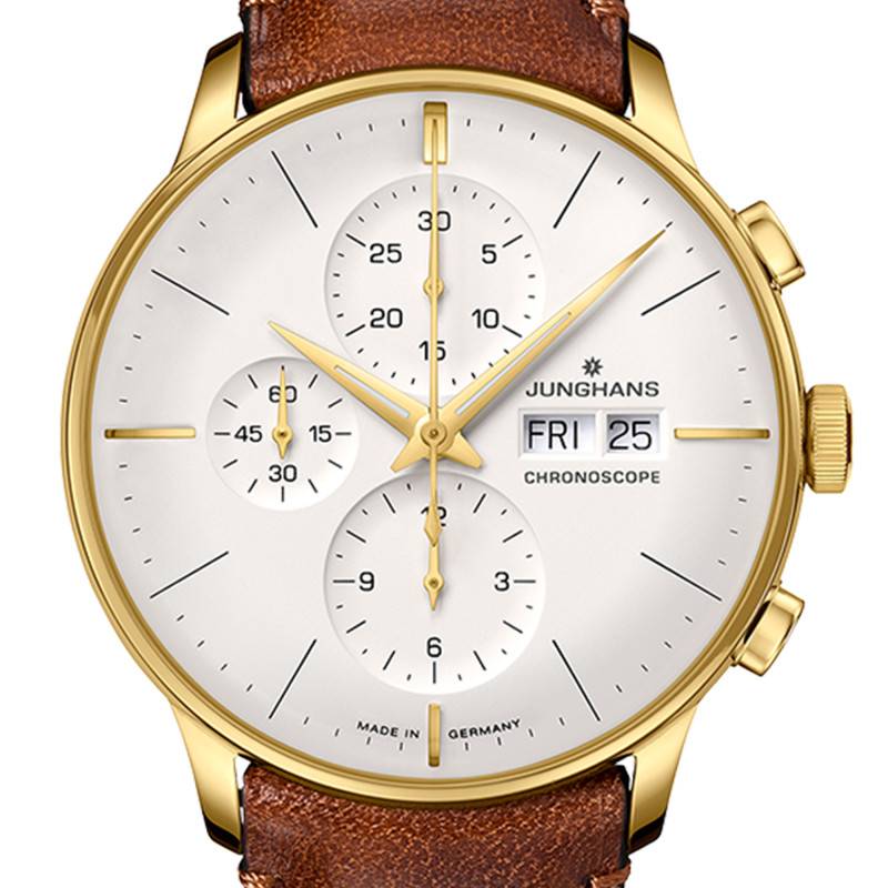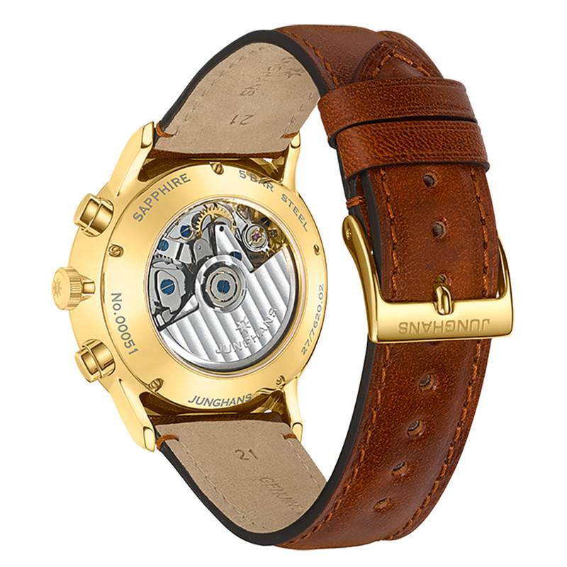 Le cadran blanc de cette montre est un modèle de sophistication et de fonctionnalité. Il incarne une lisibilité exceptionnelle grâce à la présence d'index et d'un chemin de fer des minutes, assurant une lecture précise du temps à tout moment. Les aiguilles sont dotées d'une substance luminescente, permettant une visibilité efficace même dans l'obscurité. Le cadran intègre un guichet pour le jour et la date, positionnés avec élégance pour une fonctionnalité discrète mais accessible. La montre est également équipée de compteurs additionnels qui offrent des fonctionnalités de chronométrage et de mesure précieuses pour les amateurs de précision. Le design de ce cadran, épuré mais riche en détails, reflète le savoir-faire exceptionnel de la maison Junghans, soulignant un équilibre parfait entre esthétique et praticité.