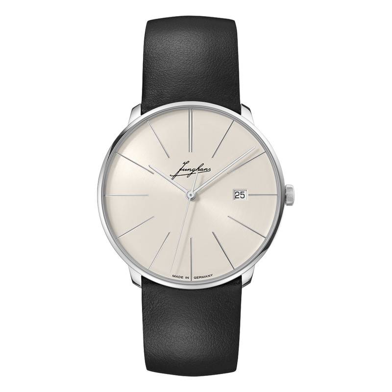 Le boîtier dévoile un sublime cadran rond de couleur gris clair saisissante qui apporte à la montre une bouffée de fraîcheur et de douceur. Ce dernier se pare d'un fond satiné et d'une finition soleillée qui lui accordent un charme supplémentaire tout en permettant une lecture de temps fluide et claire. Au centre, se présentent deux aiguilles bâtons accompagnées d'une fine trotteuse de couleur grise qui s'animeront avec fluidité pour donner les heures, les minutes et les secondes. Elles pointent toutes les trois, douze index bâtons taillés en diamant, dont le long aspect confère à l'ensemble une touche plus intemporelle. L'index de midi est présenté en bâton double pour un rendu plus éblouissant. Votre lecture temporelle est complétée par un guichet de fond blanc installé à 3h qui indiquera la date au moyen de chiffres arabes noirs. Pour finir, Junghans appose le label “Made in Germany” à 6h, gage d'authenticité, et marque sa signature d'époque sous 12h, apportant la touche finale à sa création.