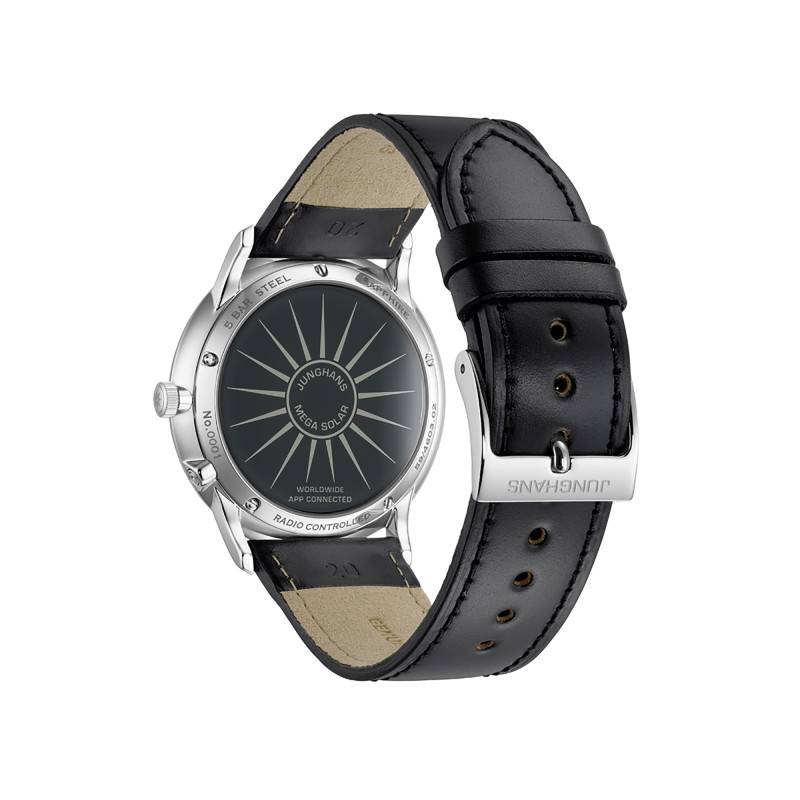 Sous son extérieur raffiné, la montre abrite un mouvement solaire de calibre J101.85 signé Junghans, illustrant l'innovation et la précision technologique. Ce mouvement permet non seulement d'alimenter la montre grâce à la lumière, minimisant ainsi la nécessité de remplacer la pile, mais il offre aussi une fiabilité exceptionnelle avec un mécanisme radio-piloté pour une mise à jour automatique et régulière de l'heure. Ce mouvement ingénieux ne se contente pas de maintenir les heures, minutes et secondes parfaites ; il gère aussi la fonction calendrier, tenant l’usager informé des dates à tout moment.