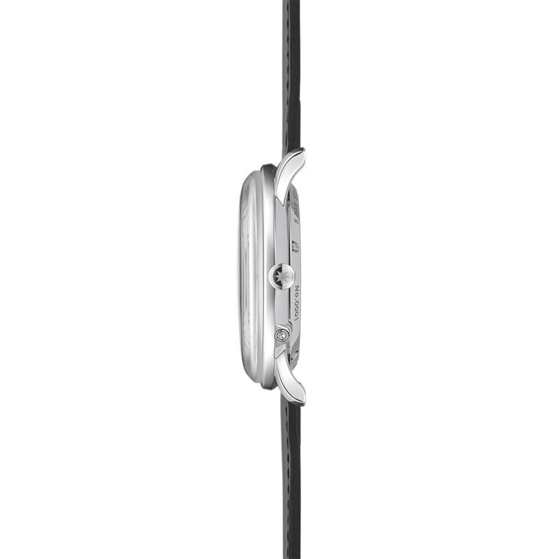 Le cadran s'illustre par sa couleur blanche épurée, offrant une toile de fond claire qui met en valeur chaque indicateur de temps avec une lisibilité parfaite. Les index prennent la forme de fins traits qui, bien que discrets, apportent une précision absolue à la lecture de l'heure. Les aiguilles minimalistes, en forme de bâton, survolent ce cadran avec élégance et efficacité. Ce modèle intègre un utile guichet de date à 3 heures, offrant une vue claire et instantanée de la date actuelle. Enveloppé dans un verre saphir bombé avec traitement antireflets, le cadran est protégé contre les rayures et les reflets indésirables, garantissant une visibilité optimale en toutes circonstances.