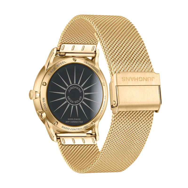 Sous le boîtier se trouve un mouvement solaire de haute précision signé Junghans, modèle J101.85. Ce calibre intègre la technologie avancée du radio-pilotage, garantissant que la montre s'ajuste automatiquement pour garder une exactitude précise, tant au niveau des heures, des minutes que des secondes. Cette innovation technologique offre le meilleur des mondes, alliant une précision imbattable à une maintenance aisée, réduisant les besoins en ajustements manuels.
