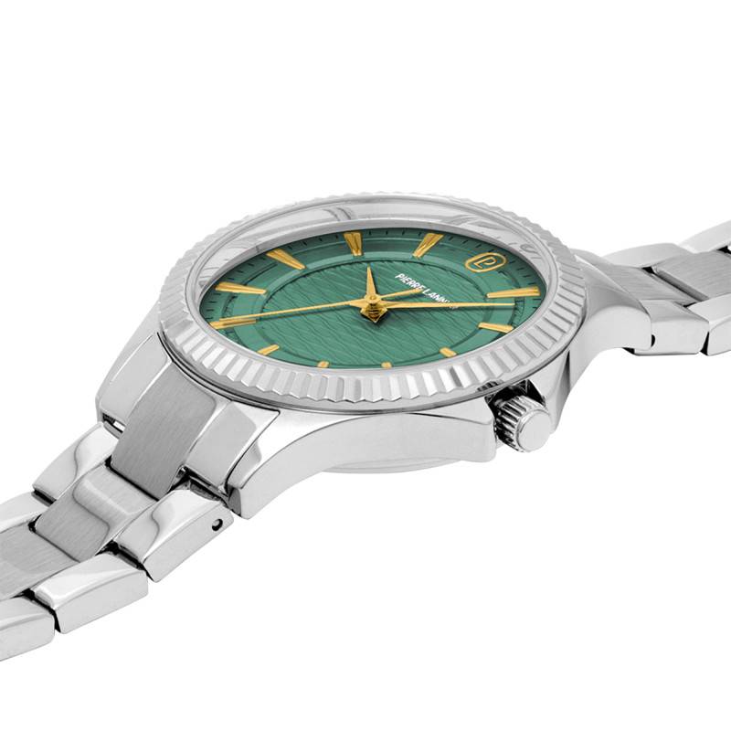 Le cadran de cette montre est une véritable œuvre d'art en miniature. Avec sa couleur verte profonde, il est embelli par un motif de vagues qui ajoute une dimension dynamique et fluide à cette pièce. La finition soleillée joue brillamment avec la lumière, créant des reflets chatoyants qui attirent irrésistiblement le regard. Les aiguilles élégantes, épurées et non luminescentes, parcourent le cadran avec grâce, indiquant les heures, minutes et secondes grâce à un affichage analogique classique. Ce cadran protège le précieux mouvement à quartz grâce à un verre minéral, reconnu pour sa durabilité et sa résistance aux chocs.