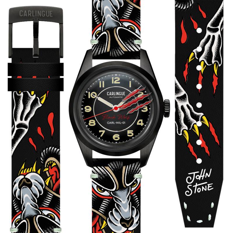 Le bracelet est une véritable œuvre d'art conçue par l'artiste tatoueur John Stone. Réalisé en cuir de bovin, il présente un motif mélangeant du rouge et du noir qui attire l'œil et accentue le caractère unique de la montre. L'entrecorne de 18 mm garantit un ajustement parfait, tandis que le fermoir boucle ardillon assure un maintien sécurisé et élégant.