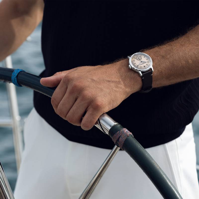 Le cadran de cette montre Millésime est une pure merveille de design subtil. Recouverte d'un verre saphir avec un double traitement antireflets, la surface sablée de couleur beige offre un éclat discret et chic. Les aiguilles luminescentes prévues pour capter la lumière, grâce à leur traitement en SuperLuminova, assurent la lisibilité même en conditions de faible éclairage. Les index et le chemin de fer des minutes sont soigneusement disposés pour guider aisément la lecture de l'heure. Un compteur additionnel de petites secondes ajoute une complication raffinée à ce cadran minimaliste mais détaillé.
