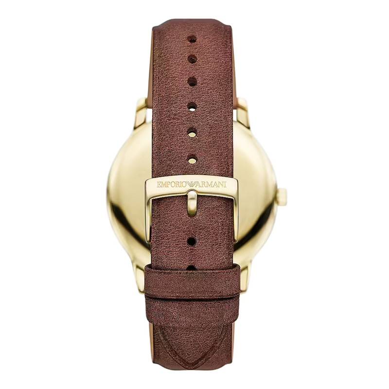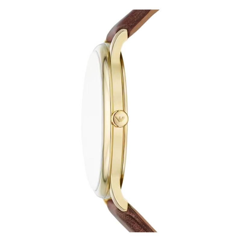 La montre Minimalist d'Emporio Armani se distingue par son design épuré et sa structure élégante. Le boîtier rond de cette pièce remarquable est réalisé en acier inoxydable, bénéficiant d'une finition en PVD jaune polie qui lui confère une allure aussi brillante que raffinée. Ce modèle, avec un diamètre généreux de 42 mm, convient parfaitement au poignet masculin moderne, offrant un équilibre parfait entre présence et confort.