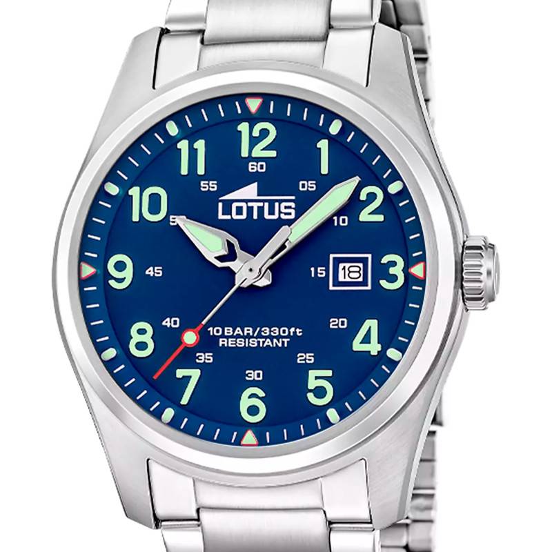 Le cadran de cette montre Lotus est une véritable œuvre de clarté et de fonctionnalité. Sa teinte bleue mate lui confère une modernité indéniable tout en restant sobre et élégante. Les chiffres arabes luminescents entourent le cadran, offrant une lecture facile même dans des conditions de faible luminosité. Les aiguilles, également luminescentes, ajoutent non seulement une touche pratique mais aussi esthétique, accentuant la visibilité à n'importe quelle heure du jour ou de la nuit. Un guichet date subtilement intégré à 3 heures rappelle la précision suisse tout en restant fidèle à l'esthétique épurée de la montre. Le chemin de fer des minutes minutieusement inscrit autour du cadran complète cette expérience utilitariste, offrant à la fois fonctionnalité et élégance.