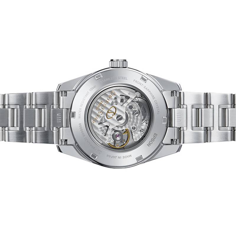 Ce modèle prestigieux dispose d'un cadran rond classique avec un fond noir. Faisant preuve de discrétion et de sobriété, cette montre pourra alors être portée en toutes circonstances. Vous apercevrez que deux aiguilles sont disposées sur le cadran. Elles vous indiqueront les heures et les minutes quotidiennement. La trotteuse accompagne ces dernières et vous orientera vers les secondes. Deux chiffres romains sont présents à 12h et 6h. Des index silver en forme de bâtons marquent les heures et sont accompagnés par un chemin de fer des minutes qui se forme sur le pourtour du cadran. De légers ronds sont également présents toutes les heures et sont luminescents. Ils vous faciliteront la lecture de l'heure quelque soit l'endroit dans lequel vous vous trouverez. Ce garde-temps pourra vous communiquer la date du jour à l'aide du guichet-date qui se forme à 3h. La manufacture horlogère Orient Star choisit de préciser le mouvement de ce garde-temps sur le cadran par la mention "Automatic" à 6h. Enfin, Orient Star signe son oeuvre à 6h et y incorpore également son logo.