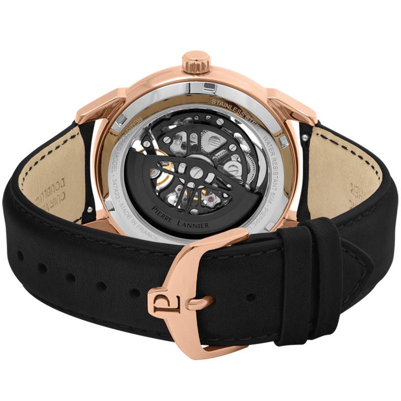 Pierre Lannier est une marque horlogère française qui conçoit des montres de qualité qui lui ont permis de se démarquer sur le marché de l'horlogerie. La marque effectue un travail minutieux lors de la conception de ces modèles dans le but de proposer à sa clientèle des garde-temps fiable. Ces créations vous orneront au quotidien et ne passeront pas inaperçues à votre poignet. Découvrez la montre 347A233 issue de la collection Monarck qui ne manquera aucune occasion de sublimer votre style. Elle se pare d'un boîtier de 70 gr fabriqué en acier inoxydable mis en avant par une finition polie qui rend sa couleur rose dorée éclatante. Il se pare d'une forme ronde et mesure 43 mm de diamètre pour une épaisseur de 11,60 mm, des dimensions pensées pour les poignets d'hommes. Son cadran est surplombé par un verre minéral et vous remarquerez à 3 heures la présence d'une couronne crantée qui vous permettra de manipuler les éléments centraux avec facilité. Enfin, le fond de boîte de cette montre permet une étanchéité de 50 mètres.