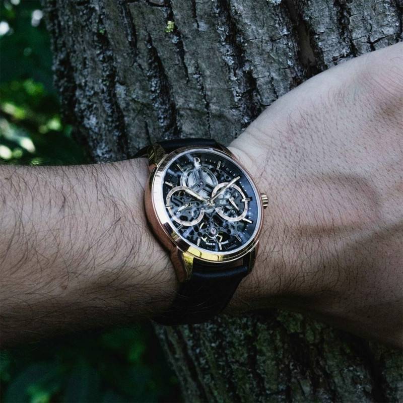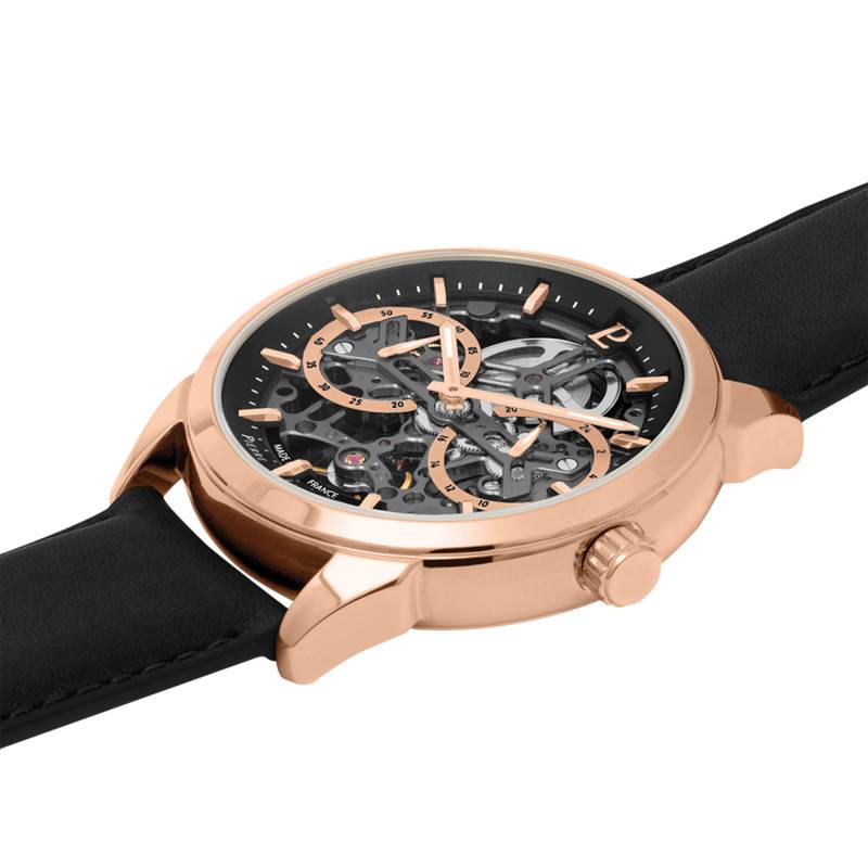 Le cadran squelette de cette montre permet une vue imparable sur son mécanisme interne. Il arbore un fond noir semi-mat qui vous accordera un affichage analogique clair. Il est équipé d'indicateurs arborant une belle couleur rosée, un chemin de fer affichant les minutes ainsi que des index bâtons qui vous apporteront plus de précision sur les heures. Les aiguilles au centre vous communiqueront les heures et les minutes et sont recouvertes d'un traitement luminescent pour une lecture temporelle optimale. Pour plus de fonctionnalités, deux compteurs prennent place à 3 et 9 heures et communiquent les 24 heures et les petites secondes. La mention "Made in France" prend place à 6 heures suivie du nom de la marque et à 12 heures le logo prend place.