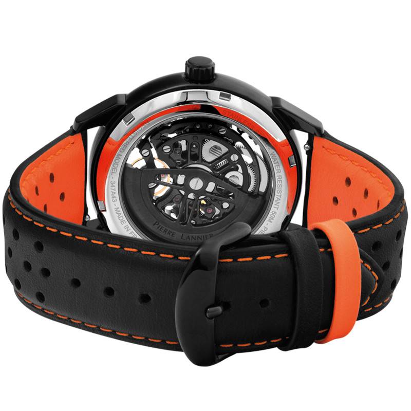 Le bracelet de cette montre est conçu en cuir de veau de couleur noire. Il mesure 22 mm de largeur au niveau de l'entre-corne et dispose d'une longueur de brin long de 120 et de 80 mm pour le brin court. Il se termine par une boucle ardillon noire et son design est rehaussé par sa finition perforée et ses surpiqûres orange sur ses extrémités. Il se posera parfaitement à votre poignet et vous conférera une belle allure.