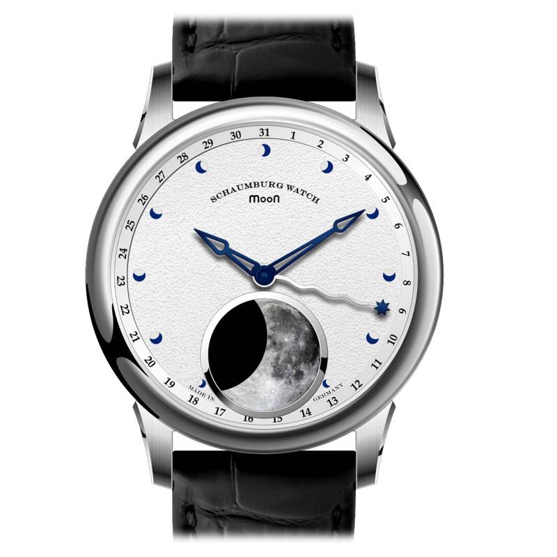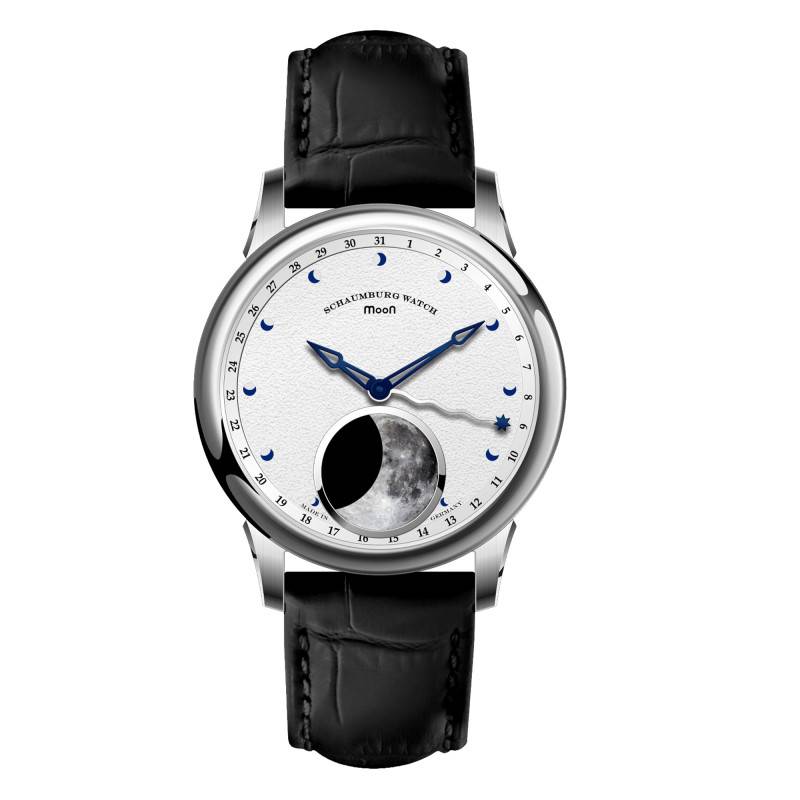 La maison horlogère allemande Schaumburg Watches confectionne des garde-temps dotés d'une qualité remarquable et au design révolutionnaire. Dans cette collection, il vous est présenté des montres à phase lunaire. Cette montre MooN grand perpetual - one est d'une beauté exquise, elle a l'avantage de pouvoir s'accorder avec toutes tenues. Cette dernière a été réalisée avec un savoir-faire horloger élevé et une maîtrise des finitions parfaite. Ce modèle est équipé d'un boîtier plaqué rhodium, fabriqué en acier poli et brossé sur un diamètre de 43 millimètres. Un verre saphir apprécié pour sa qualité et sa dureté surplombe ce boîtier argenté, il bénéficie d'un traitement anti-rayures. Le bouton de correction près de 8 heures, permet une rotation de l'ombre de la terre au-dessus de la lune, de sorte qu'une pleine lune peut être ajustée avec précision à 22 h 05. De plus, un bouton remontoir est présent à 3 heures, pour vous permettre de régler les aiguilles de ce modèle. Pour finir, le fond de boîte de cette montre est maintenu par des vis et transparent, ce qui vous offre la possibilité d'observer le mécanisme tout en garantissant une étanchéité de 5 ATM.