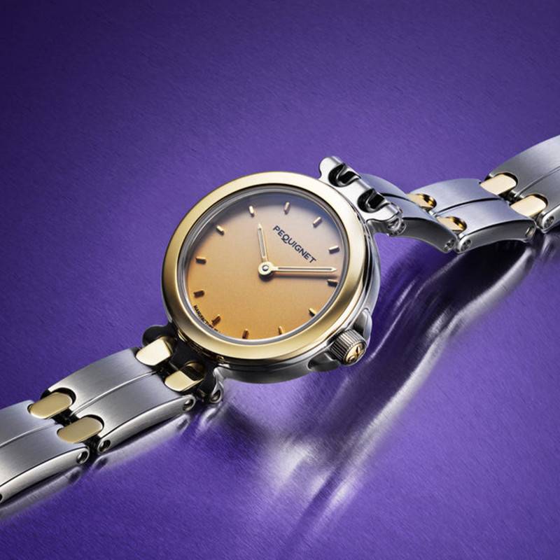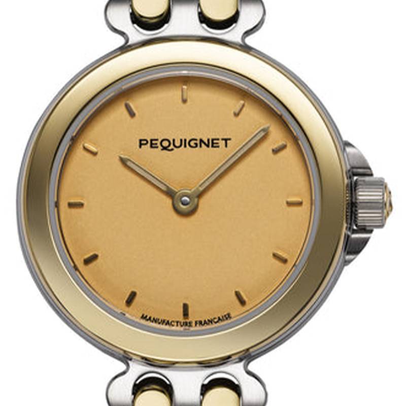 Le bracelet de la Pequignet Moorea, en harmonie avec le boîtier, est façonné en acier inoxydable 316L, marié à de l'or jaune, créant un design bicolore époustouflant. Il présente une finition polie qui reflète subtilement la lumière, accentuant l'éclat de ce bracelet exceptionnel. Sa largeur d'entrecorne de 11,70 mm permet un ajustement parfait autour du poignet, tandis que le fermoir à boucle déployante assure une fermeture sécurisée et pratique.
