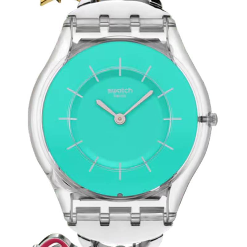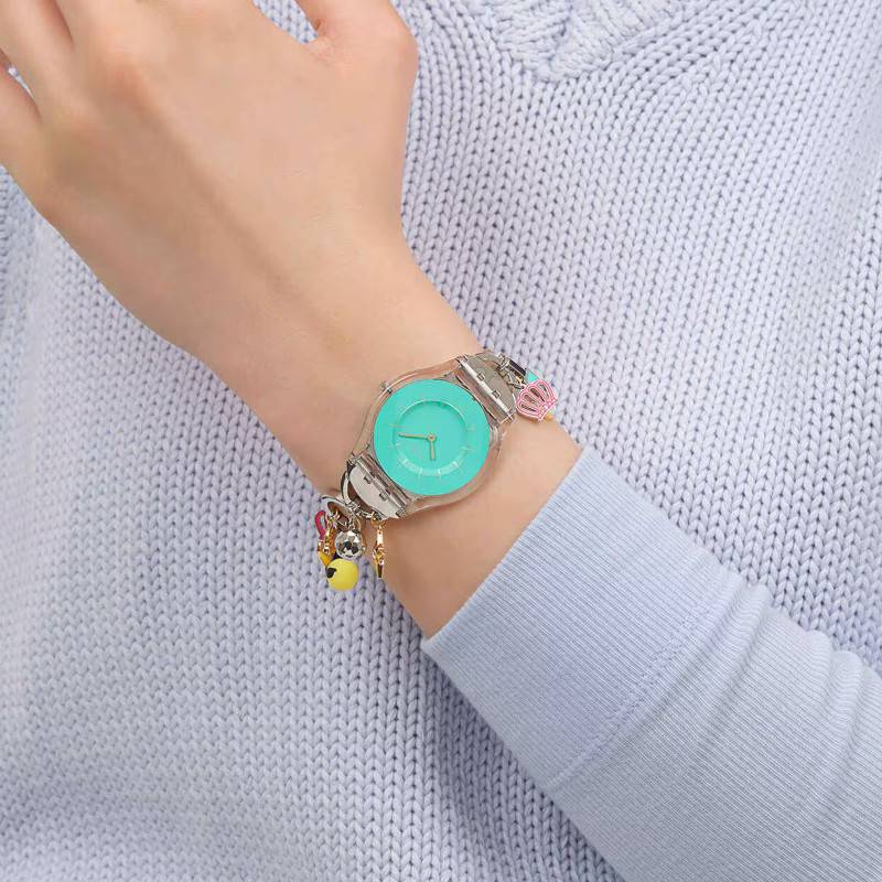 Le cadran de cette montre est une merveille visuelle avec sa teinte turquoise éclatante. Les index imprimés se détachent de façon distincte, offrant une lecture facile du temps. Les aiguilles argentées glissent avec une précision exceptionnelle grâce à leur mouvement quartz. Son design simple et élégant sans chiffres - uniquement les indications d'heures et minutes - contribue à une décoration minimaliste séduisante. Protégé par un verre plat robuste, ce cadran offre une profondeur et une luminosité qui capturent la lumière superbement, complétant ainsi l'aura moderne et joyeuse de la montre.