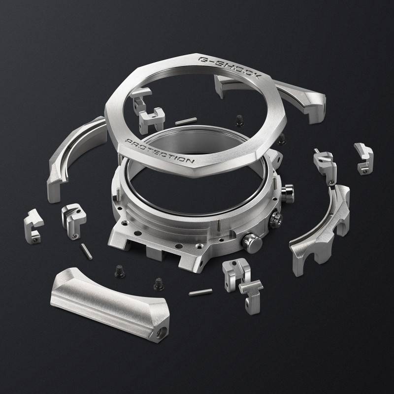 La montre Casio G-Shock MRG 2100 'Hanada-Iro' se distingue par son design robuste et élégant. Confectionnée avec un boîtier octogonal en titane, elle mesure 49,50 mm de longueur et 44,50 mm de largeur avec une épaisseur de 13,60 mm, offrant ainsi une présence notable au poignet tout en restant légère (122 g). Son allure dynamique est sublimée par une lunette en cobarion, un matériau connu pour sa dureté et sa résistance aux rayures. Le fond de la montre est fixé avec des vis, garantissant une étanchéité optimale jusqu'à 20 ATM. Cette construction robuste témoigne d'une qualité exceptionnelle et d'une durabilité incomparable. Grâce à son verre saphir traité anti-reflets, cette montre protège efficacement son précieux cadran tout en offrant un confort visuel sous tous les angles.