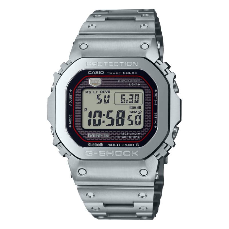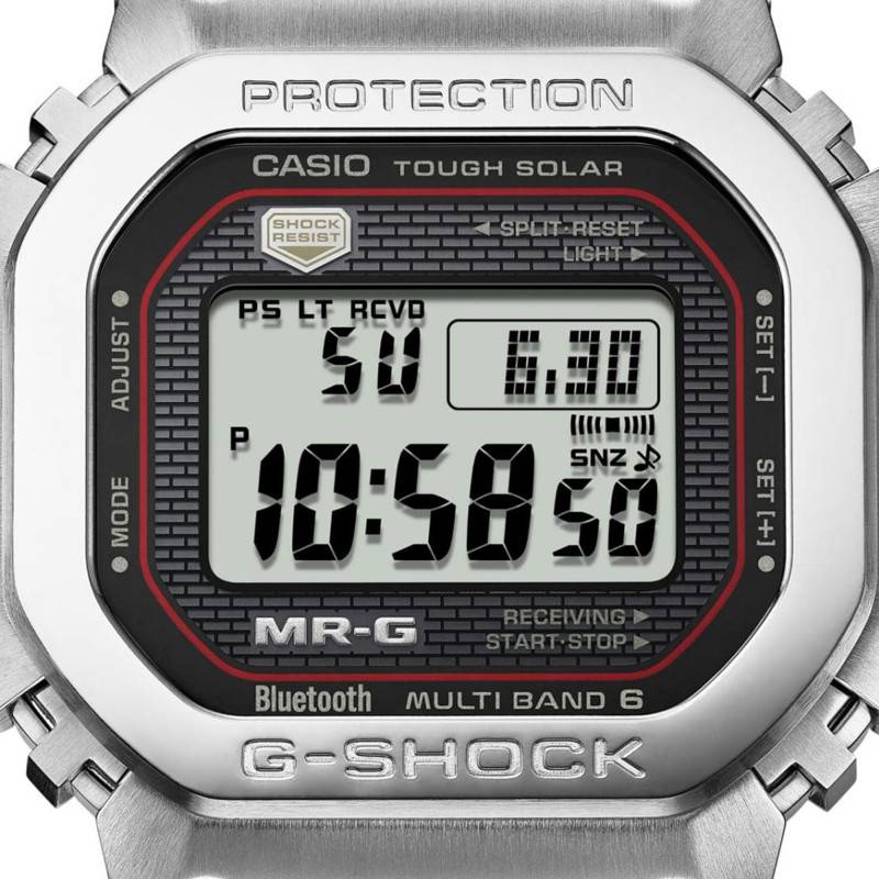 Le boîtier présente un charmant cadran de forme octogonale qui vous assurera une lecture temporelle fluide et claire en tout temps et viendra dynamiser votre allure de jour comme de nuit. Son fond noir arbore un design au motif en brique encadré par une ligne rouge qui fait écho au design original de la première G-Shock. Il dévoile au centre un écran numérique LCD de base grise et à l'affichage noir qui vous indiquera l'heure et les informations calendaires. Il affichera également les autres fonctions offertes telles que le chronomètre, l'heure universelle ou l'alarme. Portant le logo “Shock Resist”, le cadran est marqué par quelques indications comme les fonctions de boutons poussoirs, le nom “MR-G” et la mention "Multi-Band 6”.