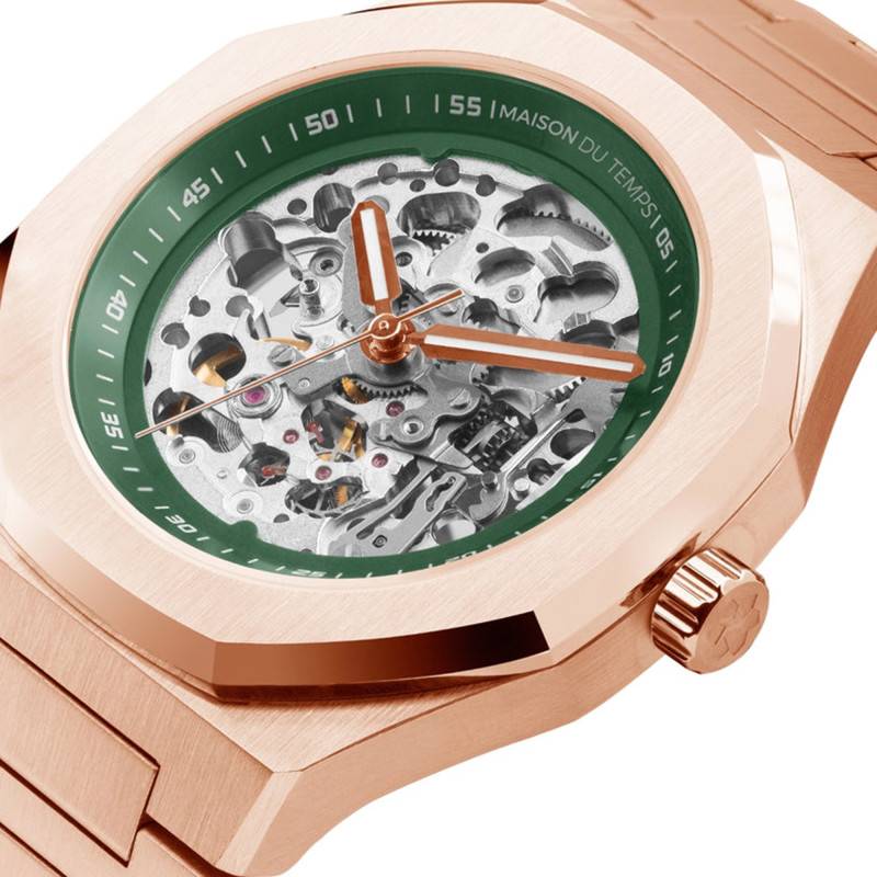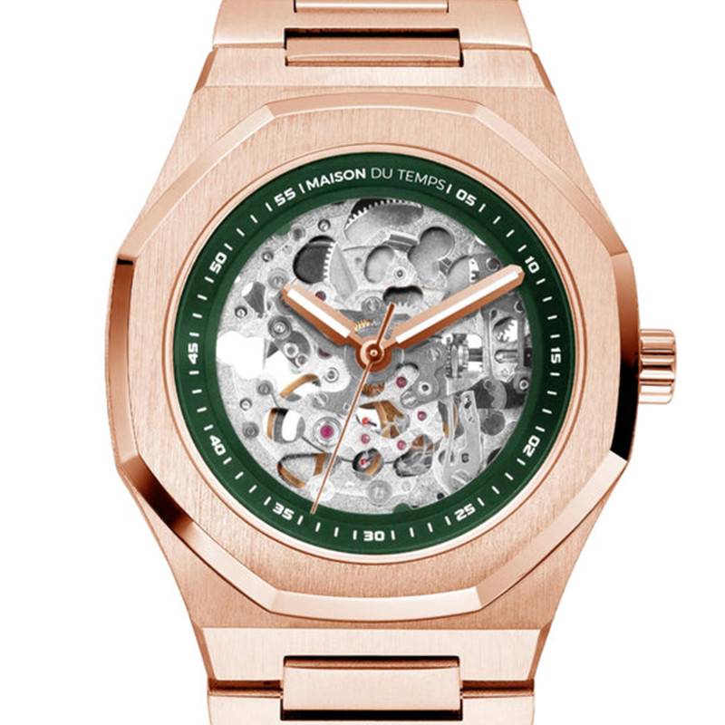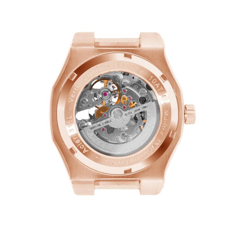 Cette montre allie à la fois style et fonctionnalité. Avec son boîtier octogonal en acier inoxydable 316L, elle propose une esthétique moderne et robuste. Le mélange de finitions brossées et polies offre une profondeur visuelle, faisant ressortir la teinte rose de l'acier. Pesant 145 grammes, elle se distingue par sa présence au poignet tout en étant agréablement confortable grâce à un diamètre de 40 mm et une épaisseur de 11 mm. Ce garde-temps est doté d'une lunette en acier inoxydable, rehaussant l'esthétique générale. Le verre saphir couvre le cadran et offre une transparence et une protection optimales, renforçant la durabilité de cette pièce. Le fond transparent et vissé permet d'admirer le fonctionnement du mouvement tout en garantissant une étanchéité et une sécurité.