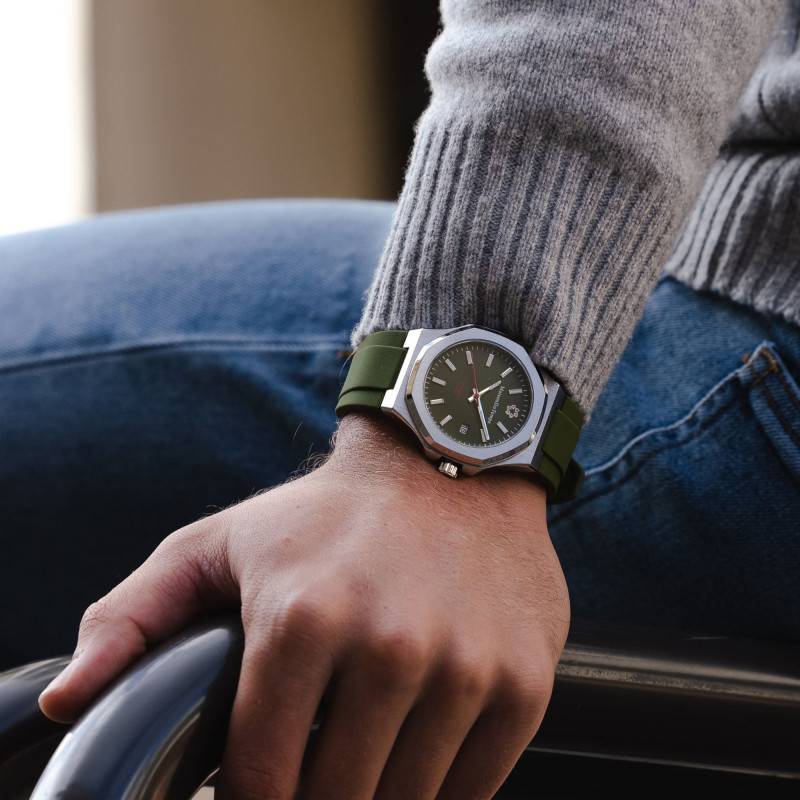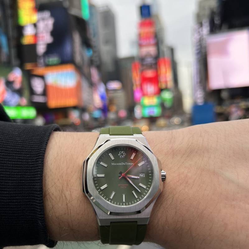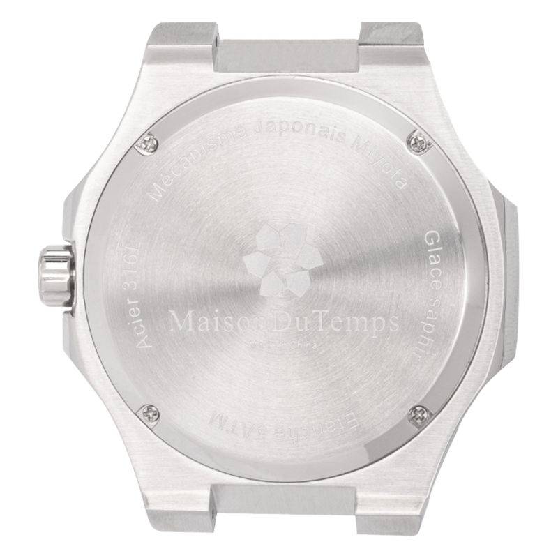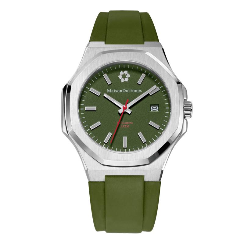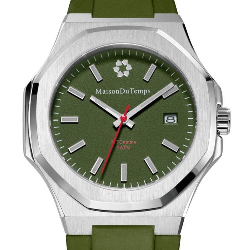 La marque Maison Du Temps a été pensée, réalisée et lancée par Hugo Delaleu, professionnel passionné de montres et d'innovations. Horloger de métier, spécialisé dans les marques les plus prestigieuses, Hugo a souhaité apporter cette touche de raffinement au poignet de tous. Cette montre MTGamma Kaki allie élégance et robustesse. Le modèle se compose d'un boîtier en acier inoxydable 316l d'un diamètre de 42 mm qui sera le choix parfait pour un homme en quête de confort. Au-dessus de sa forme octogonale prend place un verre saphir qui protège avec résistance le cadran des risques d'usure et d'éraflures inesthétiques. La couronne crantée estampillée par le logo de la marque à 3 heures vous permettra de régler les éléments centraux. Enfin, le fond de boîte maintenu par des vis assure au modèle une étanchéité de 5 ATM.