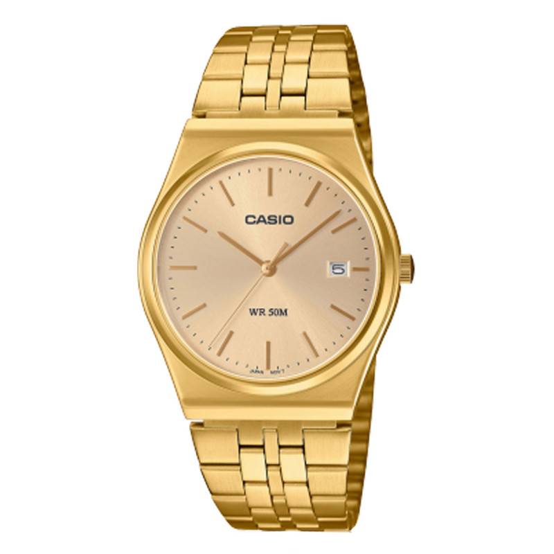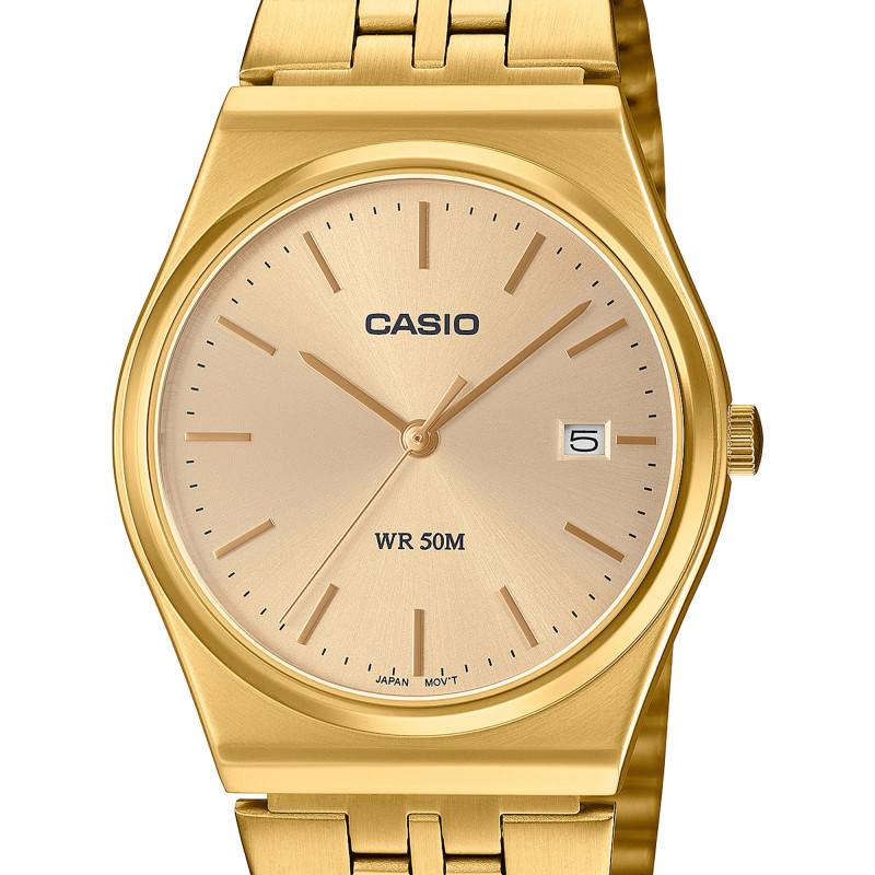 Casio est une marque qui a fait ses débuts en proposant des calculatrices. La marque figure aujourd'hui au rang des précurseurs en matière d'innovation avec des garde-temps minimalistes, fonctionnels et robustes. Parmi ses belles créations, nous vous proposons la montre MTP-B145G-9AVEF de la ligne Collection. Celle-ci est dotée d'un élégant boîtier en acier inoxydable plaqué par ionisation ce qui offre l'avantage d'une résistance accrue aux rayures et qui arbore un revêtement doré scintillant. De forme tonneau, il affiche un diamètre de 35 mm pour une épaisseur de 7,40 mm et dispose d'une longueur corne à corne de 40 mm et d'un poids de 82 grammes. Il accueille sur sa droite une petite couronne crantée qui facilite la manipulation des éléments centraux. Le cadran, quant à lui, est couvert par un verre minéral et pour ce qui est du fond de boîte, il assure une étanchéité de 5 ATM.