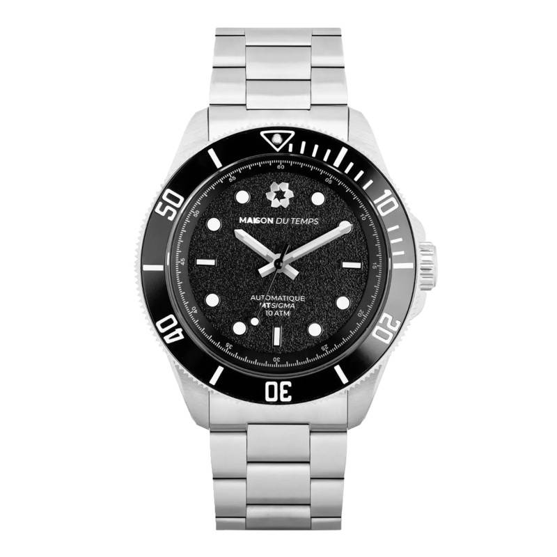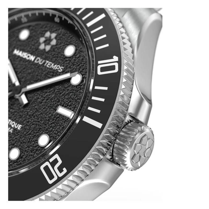 Le cadran de la montre est un véritable joyau d'ingénierie. De forme ronde, il arbore une finition grainée qui ajoute une texture captivante, reflétant subtilement la lumière dans une multitude de directions. Les aiguilles et les index sont soigneusement traités avec une matière luminescente, assurant une lecture optimale des heures, minutes et secondes, même dans l'obscurité totale. Noir, le cadran offre un contraste saisissant avec les détails blancs, renforçant ainsi sa lisibilité. La marque Maison du Temps est visible au centre, témoignant de l'exclusivité et du prestige de cette montre unique. La fonction de la lunette est rotative, un atout indéniable pour les amateurs de précision lors d'activités sportives ou aquatiques.