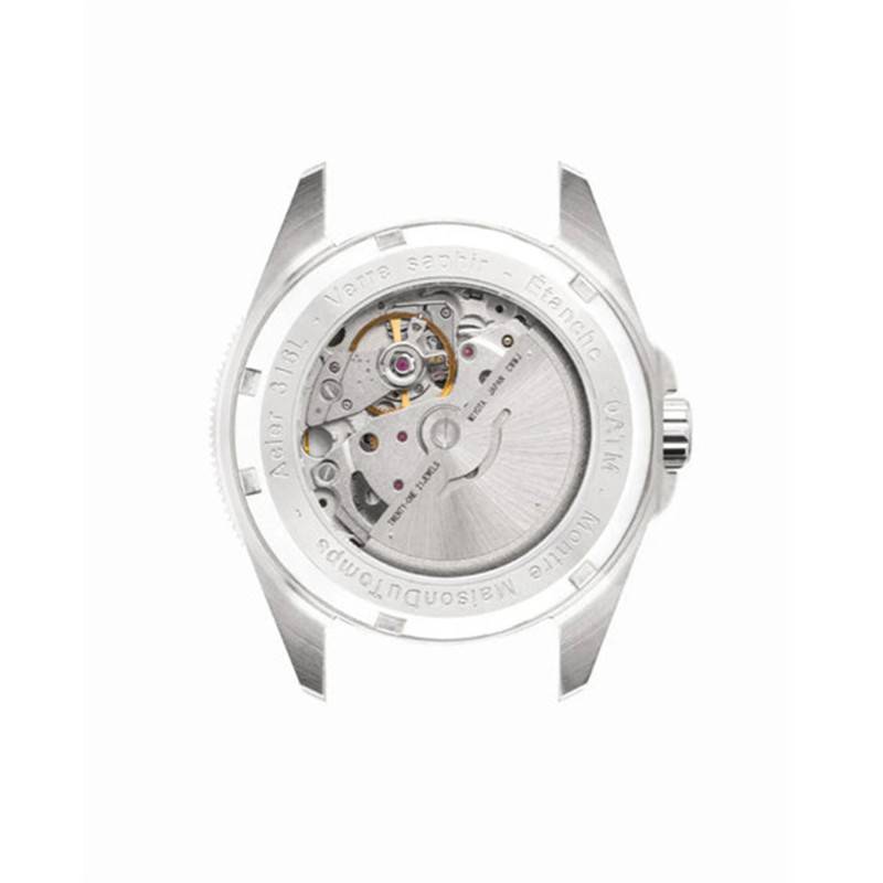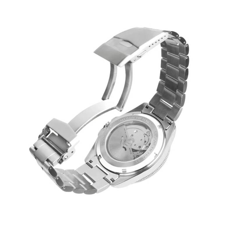 La montre proposée par Maison du Temps est un modèle masculin alliant robustesse et sophistication grâce à son boîtier en acier inoxydable 316L. Son design élégant et contemporain se reflète dans sa finition à la fois polie et brillante, conférant un aspect luxueux qui attire instantanément le regard. Le fond de la boîte est transparent et vissé, permettant d'admirer le mécanisme en toute simplicité, tout en assurant une étanchéité fiable évaluée à 10 ATM, idéale pour les aventures aquatiques.