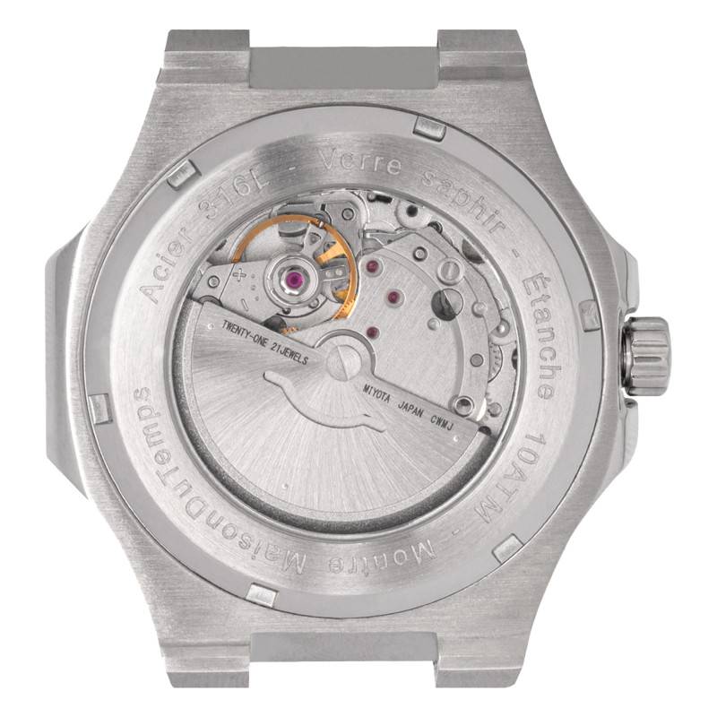 Ce garde-temps est animé par un mouvement automatique de fabrication japonaise. Il s'agit plus précisément du calibre Miyota 8215 doté de 21 rubis qui donnera vie avec fiabilité aux aiguilles et au guichet de ce modèle. Ce mécanisme oscille à une fréquence de 21.600 alternances/heure et permet une réserve de marche de 42 heures.