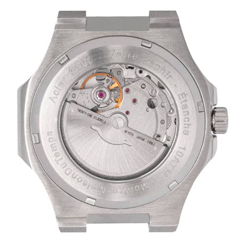 La Maison du Temps sublime l'art horloger avec cette montre qui se distingue par son boîtier majestueux octogonal en acier inoxydable 316L. La finition du boîtier brossé et poli confère à la montre une allure résolument contemporaine, tout en mettant en exergue son caractère affirmé. Les dimensions du boîtier, avec ses 40 mm de diamètre et ses 11 mm d'épaisseur, invitent à une élégance assurée, complétée par un poids judicieux de 180 g qui évoque la solidité et la présence au poignet. L'harmonie lui est conférée par sa finition satinée, une signature visuelle qui ravira les amateurs de styles élégants mais sportifs. Cette montre est dotée d'un fond de boîte de type vissé et transparent, permettant non seulement une excellente étanchéité mais aussi une ouverture à une vision mécanique fascinante.