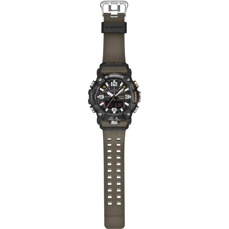 Le cadran de la Casio G-Shock MudMaster est un véritable exploit technique et esthétique. De couleur noire, il accueille des chiffres arabes surdimensionnés et des index luminescents, offrant une lisibilité inégalée, quelle que soit la luminosité ambiante. Les aiguilles luminescentes sont alignées avec un chemin de fer précis, permettant une lecture rapide et efficace du temps. Un écran numérique intégré au bas du cadran enrichit l'affichage en fournissant des informations supplémentaires à travers une interface utilisateur claire et intuitive. La fonctionnalité Super Illuminator assure un rétroéclairage brillant pour les environnements les plus sombres, renforçant encore l'utilité de cette montre dans toutes les conditions.