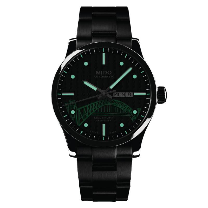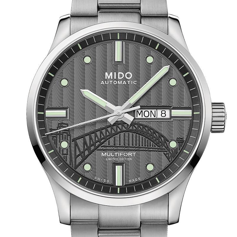 Pour cette Multifort limitée, Mido a opté pour un magnifique cadran finement décoré et rehaussé par le Harbour Bridge de Sydney, accordant à la montre une allure contemporaine captivante. Son design architectural contraste parfaitement avec sa couleur gris anthracite pour habiller avec sobriété et élégance toutes vos tenues. Son fond est survolé par deux aiguilles, en forme de bâtons, accompagnées d'une fine trotteuse. Elles vous désigneront les heures, les minutes et les secondes. À 3h, vous observerez un double guichet qui vous indiquera la date et le jour. Les heures sont marquées par des index bâtons pour 3h, 6h, 9h et 12h et par des index ronds pour le reste. Un chemin de fer des minutes vient tracer le pourtour, complétant ainsi votre lecture temporelle. Cette dernière sera possible aussi bien en milieu éclairé qu'en milieu sombre grâce à un traitement Superluminova appliqué sur l'ensemble des indicateurs. Pour finir, la marque signe sa montre par son nom et le type de mouvement sous midi et appose les mentions “Multifort Limited Edition” et “Swiss Made” à 6h.