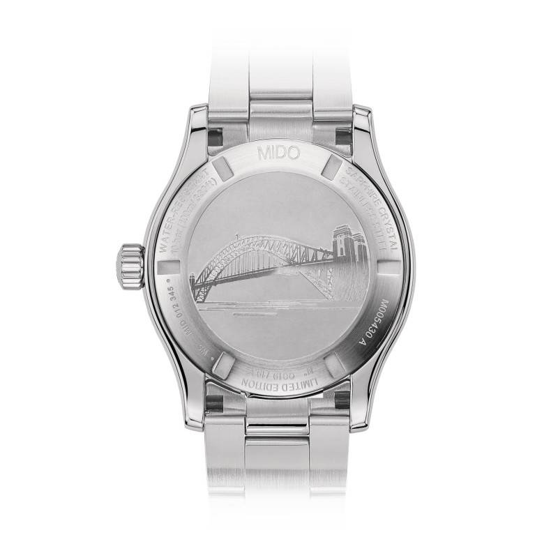 La marque Mido ne cesse de combiner innovation, fonctionnalité et matières de haute qualité dans la fabrication de ses gardes-temps. En s'inspirant des réalisations architecturales, chaque montre Mido est symbole de design intemporel, de robustesse extrême, de précision irréprochable et d'esthétique épurée. Elle vous dévoile cette sublime montre MULTIFORT 20TH IBA M005.430.11.061.81 en édition limitée à 1932 pièces, issue de sa collection phare Multifort inspirée des lignes architecturales emblématiques du célèbre Harbour Bridge de Sydney. Entre élégance et fonctionnalité, elle vous accompagnera partout avec prestance et accordera à chacun de vos looks une touche soignée et moderne. Elle se pare d'un boîtier rond en acier inoxydable 316l qui pèse 184 gr et mesure 42 mm de diamètre pour une épaisseur 10,90 mm, parfaites dimensions pour sublimer au quotidien les poignets masculins. Un verre saphir surplombe le cadran afin de le protéger contre les chocs et les rayures inesthétiques pouvant endommager sa surface. À la droite du boîtier, une couronne vissée se positionne à 3h. Elle vous servira lors du réglage manuel des heures, des minutes, de la date et du jour. Le fond de boîte est gravé par le pont de Sydney, gage d'authenticité. Vissé, il assurera une étanchéité de 10 ATM.