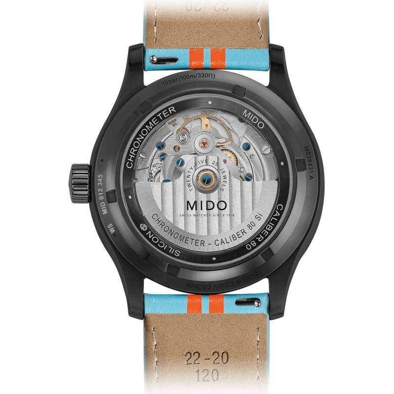 La montre Multifort Chronometer 1 Racer est fabriquée par la réputée marque Mido, son boîtier rond témoigne d'un caractère affirmé et sportif. Composée d'un acier inoxydable de qualité, sa finition en PVD noir apporte une touche moderne qui sublime son allure générale. Affichant un diamètre de 42mm et une épaisseur de 12mm, elle s'ajuste parfaitement au poignet masculin, avec un poids équilibré de 90 grammes qui assure confort et présence. Observons le fond de boite transparent, une caractéristique qui permet d'admirer le mouvement à travers un verre vissé percé de découpes subtiles.