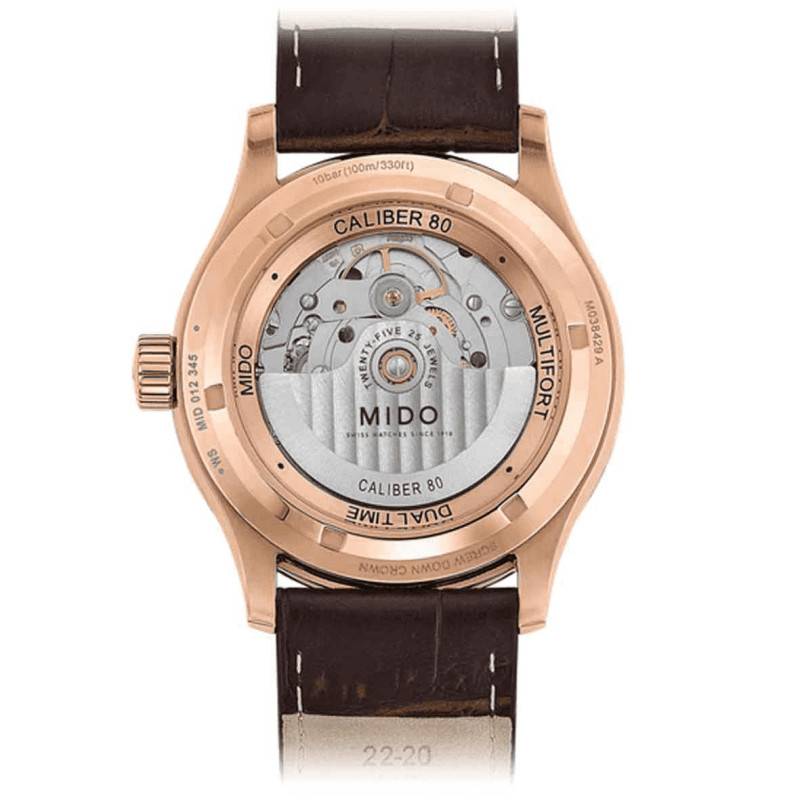La maison horlogère Suisse a vu le jour en 1918. Depuis, elle ne cesse d'innover. Son premier modèle automatique est sorti en 1967. Aujourd'hui, elle présente un nouveau modèle de sa collection phare Multifort. Tout en conservant l'ADN de cette collection, Mido dévoile une montre aux nouveaux codes esthétiques et techniques. Laissez-vous séduire par ce véritable bijoux horloger au design recherché, sophistiqué et intemporel. Le boîtier du garde-temps est en acier inoxydable au revêtement PVD rose gold apporte de la préciosité et de l'élégance au modèle. Il conviendra parfaitement aux poignets masculins de par sa taille de 42mm de diamètre pour 13.39mm d'épaisseur. Par ailleurs, un verre saphir au double traitement anti-reflets surplombe le cadran. Il protège ce dernier d'éventuels chocs grâce à ses vertus de verre robuste et inrayable. Une couronne remontoir est logée à trois heures. Enfin, le modèle possède une étanchéité de 10 ATM et le fond de boîte est vissé. Sa transparence vous permet ainsi d'admirer la magnifique scène du mécanisme en mouvement lorsque vous regardez le dos du boîtier.