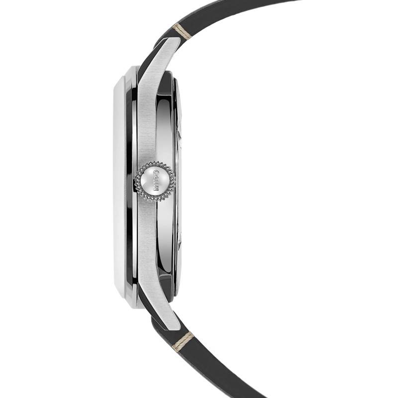 Le bracelet en cuir complète à merveille le look rétro de la montre. Il s'agit d'un cuir patiné de couleur noire. La patine est le motif unique qui se forme sur le cuir naturel au fil du temps. Chaque patine étant différente, votre garde-temps sera un objet unique et précieux qui évoluera quotidiennement à votre poignet. Le bracelet se referme à l'aide d'une boucle ardillon de couleur argentée et son entre-corne mesure 19mm.