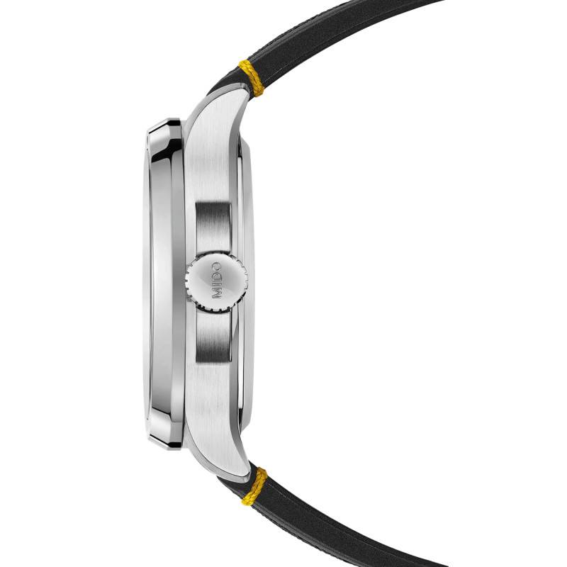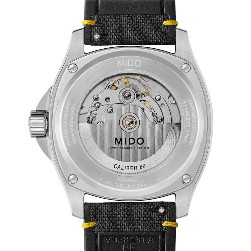 L'énergie et la précision du modèle résident dans son mécanisme. Équipée du mouvement automatique suisse Mido Calibre 80, ce garde-temps s'appuie sur la fiabilité et la durée du calibre ETA C07.651, une pièce maîtresse réputée pour sa stabilité et sa longue réserve de marche. Ce mouvement, innovant notamment par sa résistance aux champs magnétiques, assure une fonctionnalité irréprochable et une lecture du temps constante sans interruption. Il anime les fonctions principales d'heures, minutes, secondes et date, et fait partie intégrante de l'héritage horloger Mido en proposant une technologie avancée au sein d'un boîtier élégant.