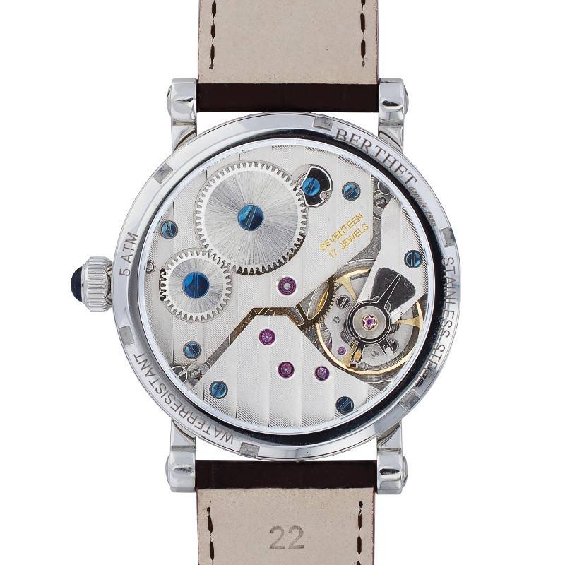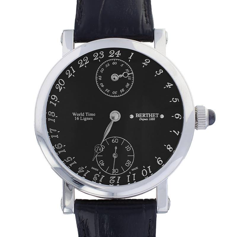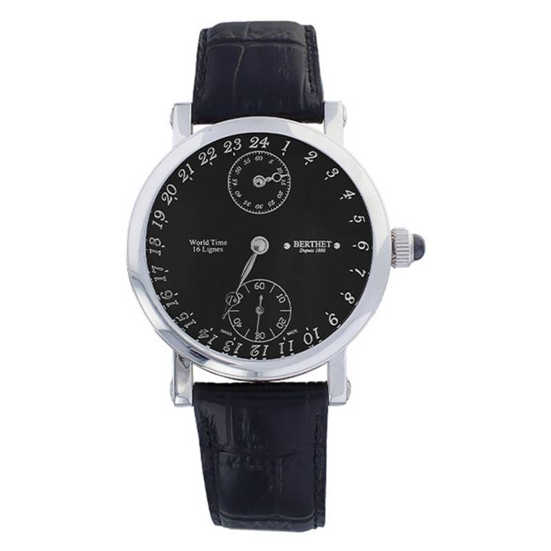 Toute l'originalité de ce garde-temps repose au sein de son cadran. De couleur noire, il se démarque par son affichage analogique non-conventionnel. En effet, vous ne retrouverez en son coeur qu'une seule aiguille de forme vintage Breguet indiquant les heures. Les secondes et les minutes seront quant-à-elles précisées à travers deux compteurs disposés à 6 et 12 heures. De plus, les marqueurs temporels présents sur le pourtour du cadran se démarquent également par un affichage spécial 24h. Contrairement aux montres traditionnelles, les heures seront indiquées sur 24h au lieu de 12h ! Les index prennent alors la forme de chiffres arabes à l'allure rétro. Enfin, la Maison Berthet signe sa création à 3 heures en lettres capitales de couleur argentée. Elle ajoute également à 9 heures la dénomination "World Time 16 Lignes" faisant écho à son affichage spécial et à son mouvement mécanique.