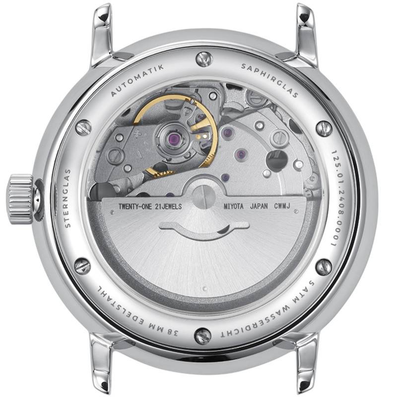 La montre Naos Automatic Steel S02-NA44-MI04 de Sternglas présente un design raffiné et moderne, parfait pour l'homme contemporain. Fabriquée en Allemagne, cette montre met en avant un savoir-faire horloger exceptionnel, alliant précision et élégance. Le boîtier de forme ronde, fait en acier inoxydable 316L, assure robustesse et durabilité, tandis que la finition polie/brillante accentue son allure chic. Avec un diamètre de 38 mm et une épaisseur de 12 mm, elle s'adapte confortablement au poignet, offrant une lecture aisée de l'heure. Son fond de boîte est transparent et maintenu par des vis, permettant d'admirer le savoir-faire technique et la mécanique complexe de cette montre.