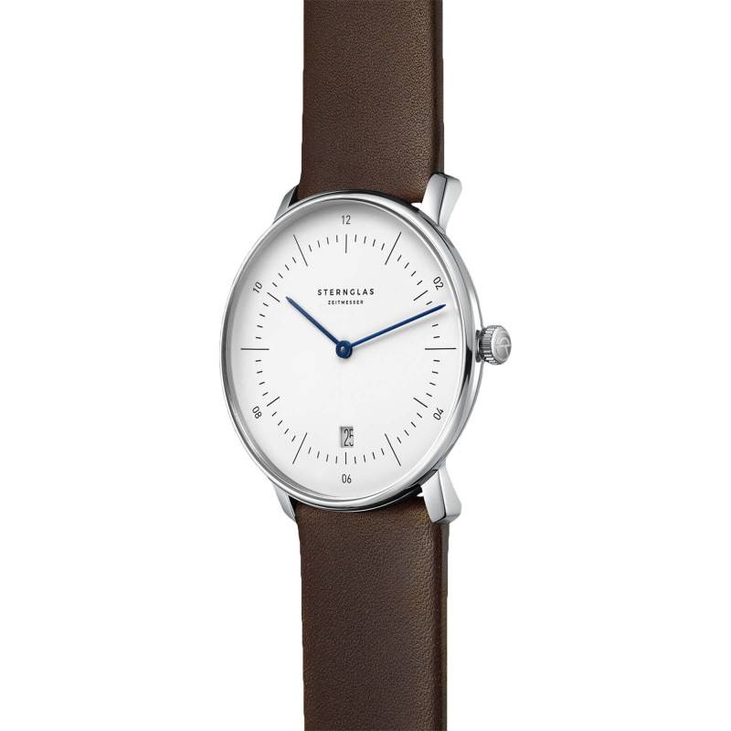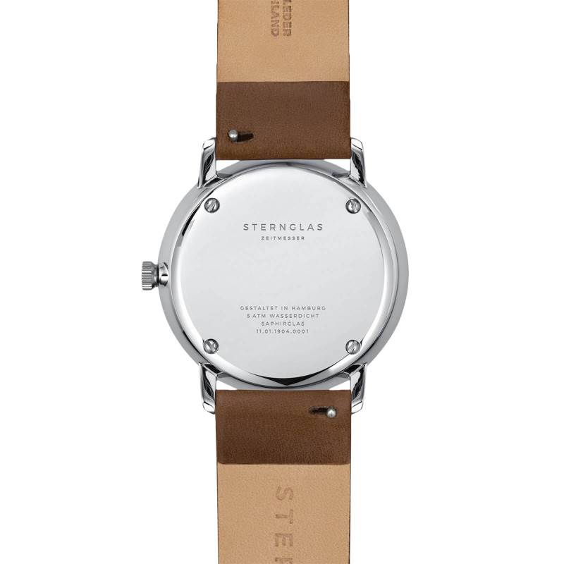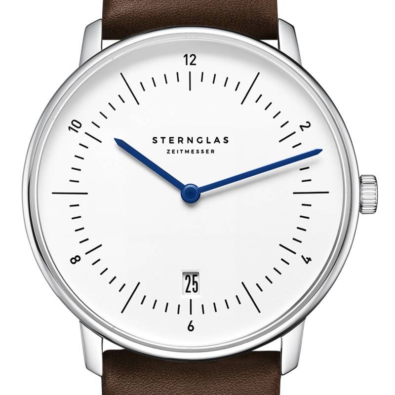 Le boîtier dévoile un épatant cadran rond facile à lire au design réduit à l'essentiel pour s'accorder parfaitement avec l'esprit Bauhaus de la montre. Doté d'une finition semi-mate, il se pare d'une belle couleur blanche qui lui apporte un air doux et frais. Son fond est rehaussé par des marqueurs noirs pour un plus bel effet au port tout en assurant un affichage net et limpide de l'heure. Deux aiguilles bâtons de couleur bleue et à l'aspect fin s'activent au centre pour désigner les heures et les minutes. Elles pointent des index en chiffres arabes et en forme de bâtons qui servent de repères pour les heures. Ceux-ci sont accompagnés par un chemin de fer des minutes échelonné par des traits fins. Doté d'un fond blanc et affichant des chiffres arabes noirs, un guichet prend place à 3h vous communiquant la date. Finalement, Sternglas signe son modèle en marquant son nom sous midi.