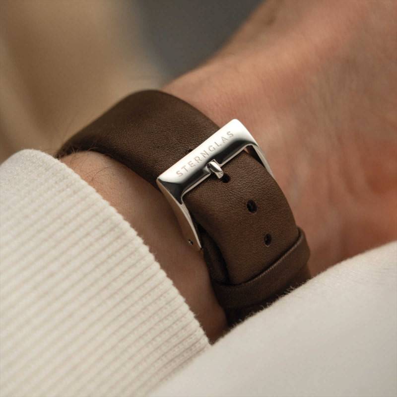 Facilement interchangeable grâce à des barres à ressort à dégagement rapide, le bracelet présenté avec cette montre est conçu en cuir de veau de haute qualité qui provient d'une usine bavaroise. Il est drapé d'une sublime couleur marron qui vous permettra de l'assortir avec toutes vos tenues et dévoile un aspect doux et velouté pour un port agréable en toute occasion. Ce bracelet de 18,50 cm de longueur viendra souligner votre poignet avec finesse et confort en habillant chacun de vos looks avec élégance et raffinement. Il est muni d'une boucle ardillon en acier inoxydable 316L pour un port à la fois aisé et sécurisé. Son entrecorne affiche une largeur de 20 mm.