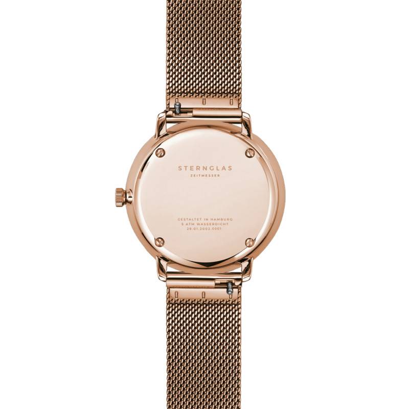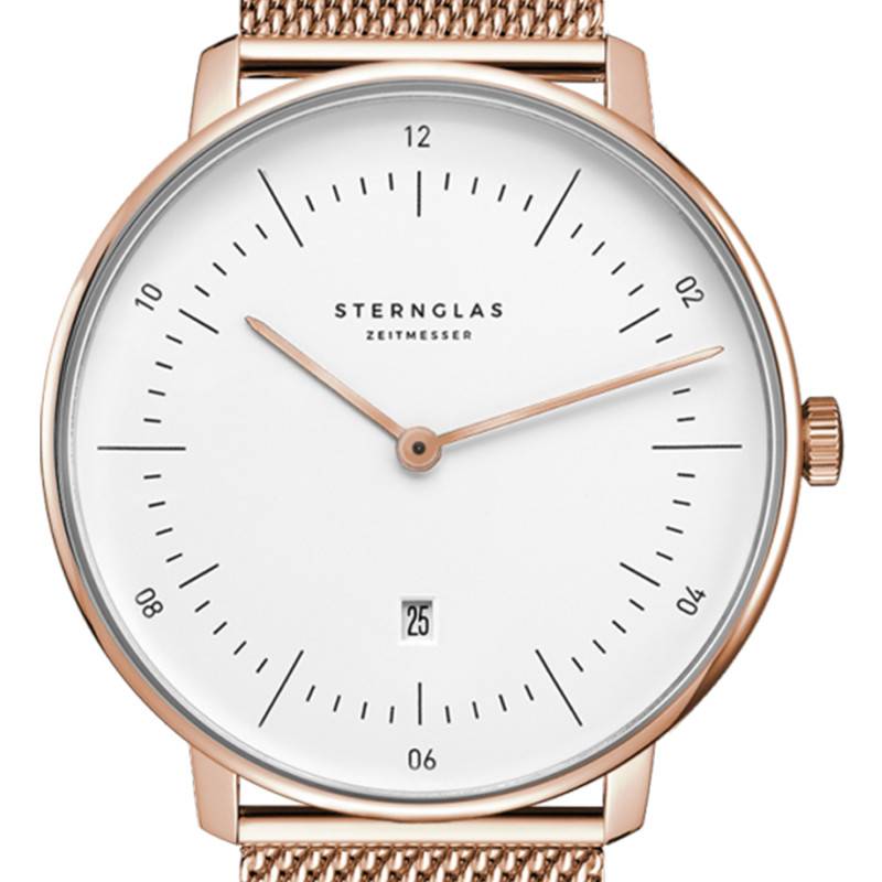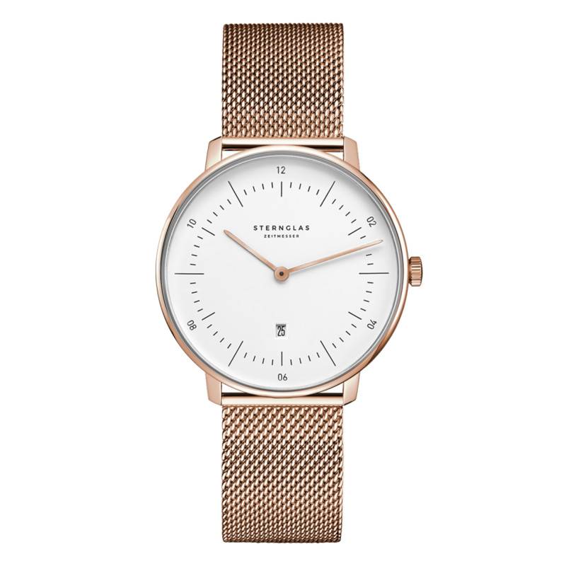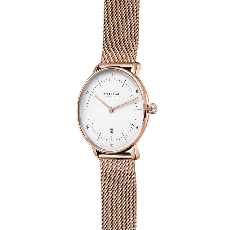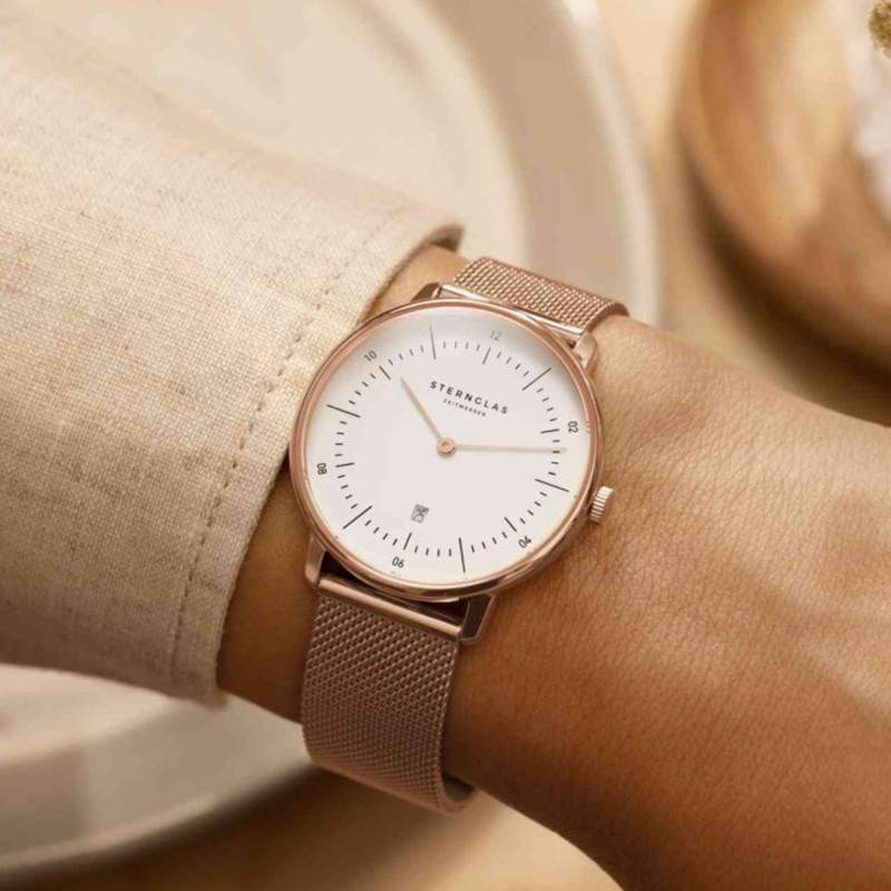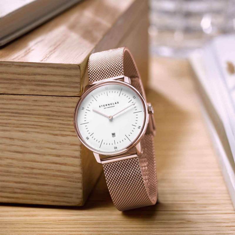 Sternglas est une marque allemande qui propose des garde-temps élégants et intemporels. Ses créations se démarquent par leurs designs minimalistes et par la qualité des matériaux utilisés. Elle propose la montre NAOS XS White Rose gold S01-ND13-MI09 fine et raffinée avec un boîtier rond conçu en acier inoxydable 316L. Poli, il est rehaussé par un traitement en PVD or rose qui lui accorde une allure chic et sophistiquée. Parfaitement adapté aux poignets féminins, il mesure 33 mm de diamètre et 6 mm d'épaisseur pour une longueur de corne à corne de 36 mm. Ce dernier est surmonté par un verre saphir bombé qui protège le cadran contre les rayures alors que son double traitement antireflet offre une lisibilité optimale. La couronne crantée à 3 heures, quant à elle, assure le réglage des heures et des minutes ainsi que celui de la date. Pour ce qui est du fond de boîte, il est maintenu par des vis et promet une étanchéité de 5 ATM.