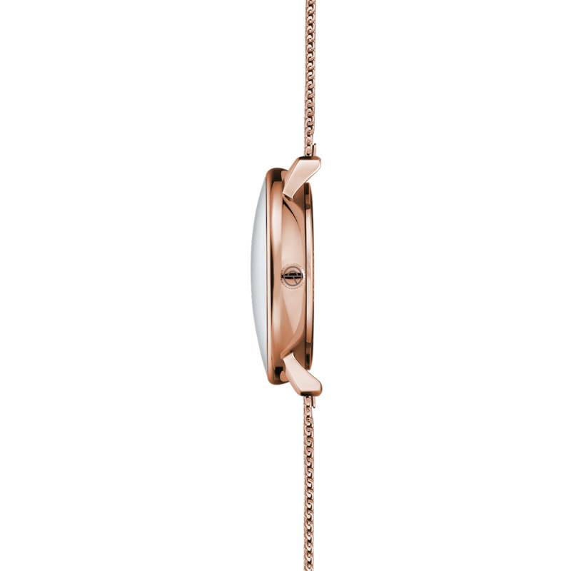 Beau et brillant, le bracelet de cette montre complète agréablement son look raffiné. Il est conçu en acier inoxydable 316L de traitement PVD or rose et de finition maille milanaise. Doté d'une largeur de 16 mm au niveau de l'entrecorne, ce bracelet est muni d'un système de changement rapide qui vous offre une polyvalence de style. L'ajustement et le maintien autour du poignet sont assurés par une boucle coulissante.
