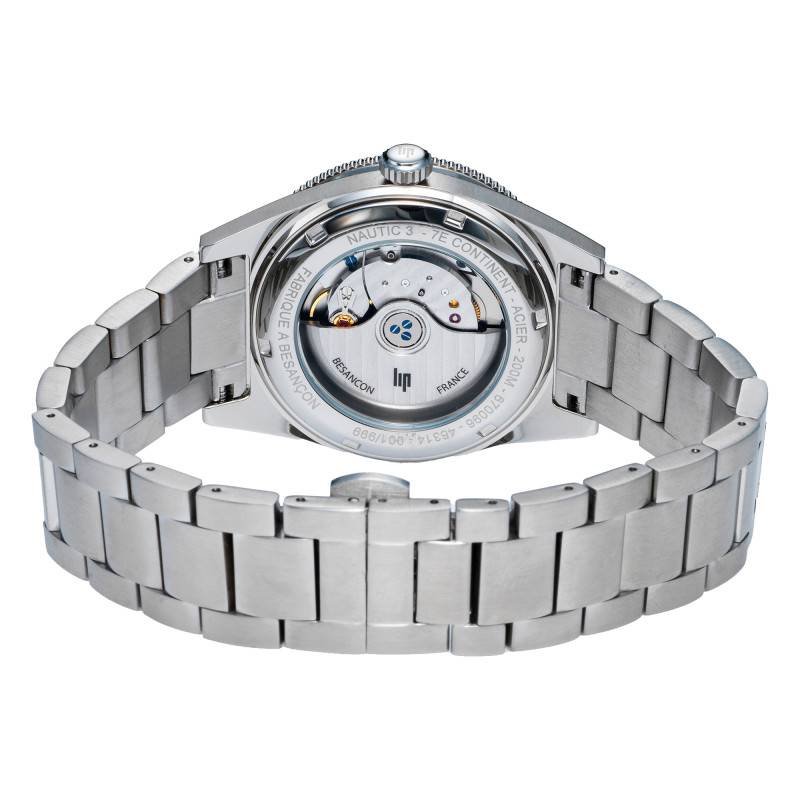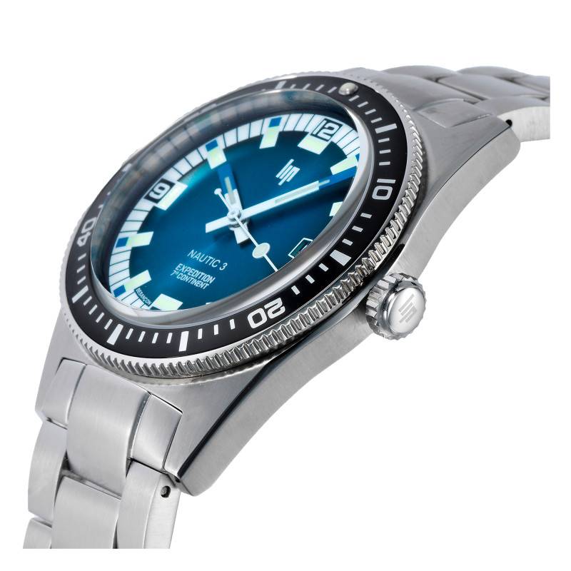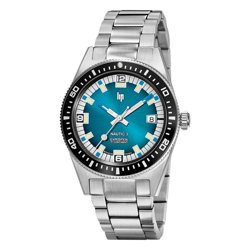 Lip est une référence incontournable de l'horlogerie française fondée en 1867 par Emmanuel Lipmann. Cette maison emblématique ne cesse de marquer les esprits par ses éblouissantes créations horlogères ancrées dans la tradition et la tendance. Ce sont des garde-temps sophistiqués de haute qualité qui se distinguent par leur esthétique épurée, leur style prononcé et leur technicité innovante. Après le grand succès de la Grande Nautic lancée en 2023, la marque s'associe aujourd'hui avec Expédition 7ᵉ Continent, une association à but non-lucratif qui a pour mission la préservation des océans, pour présenter sa nouvelle montre Nautic 3 Expédition 7e Continent 670096. Reprenant le design d'un des modèles Lip iconiques des années 60/70 et renforçant l'engagement environnemental de la marque, celle-ci est élaborée en édition limitée à 999 exemplaires numérotés. Elle fera assurément le grand plaisir de toute personne à la recherche d'un modèle de plongée durable, indémodable et précis. Ne contenant aucun élément en plastique, elle viendra vous apporter une allure sport-chic exquise en vous permettant de partir à l'aventure en toute tranquillité. Vous pourrez l'assortir avec toutes vos tenues et l'enfiler en toute occasion, d'une sortie citadine à une activité sous-marine. Son boîtier de forme tonneau mesure 39 mm de diamètre et 13,20 mm d'épaisseur, assurant un port agréable et un confort ultime tout au long de la journée. Destiné à parer élégamment les poignets masculins, il est réalisé en acier inoxydable 316L avec des finitions brossée et polie pour un plus bel effet. Sa carrure loge à 3h une couronne crantée qui se voit gravée par le nom de la marque. Celle-ci est vissée et sert au réglage des heures et de la date. Un verre saphir bombé doté d'un revêtement anti-reflets vient passer par-dessus le cadran, le protégeant contre les chocs du quotidien, renforçant l'aspect plus vintage de la montre et garantissant une visibilité optimale. Il est entouré par une lunette de plongée unidirectionnelle au design cranté. L'insert bleu foncé de cette dernière est gradué par une échelle de minutes, dont un marqueur luminescent rond à 12h, vous permettant de calculer le temps écoulé. Au verso, se dévoile un fond de boîte vissé qui assure une résistance à l'eau à une pression de 20 bar. Celui-ci dispose d'une ouverture transparente en verre, vous permettant d'admirer le mouvement de la montre et ses belles décorations. Finalement, cette montre vous sera expédiée dans un écrin spécifique conçu en carton et papier recyclables.