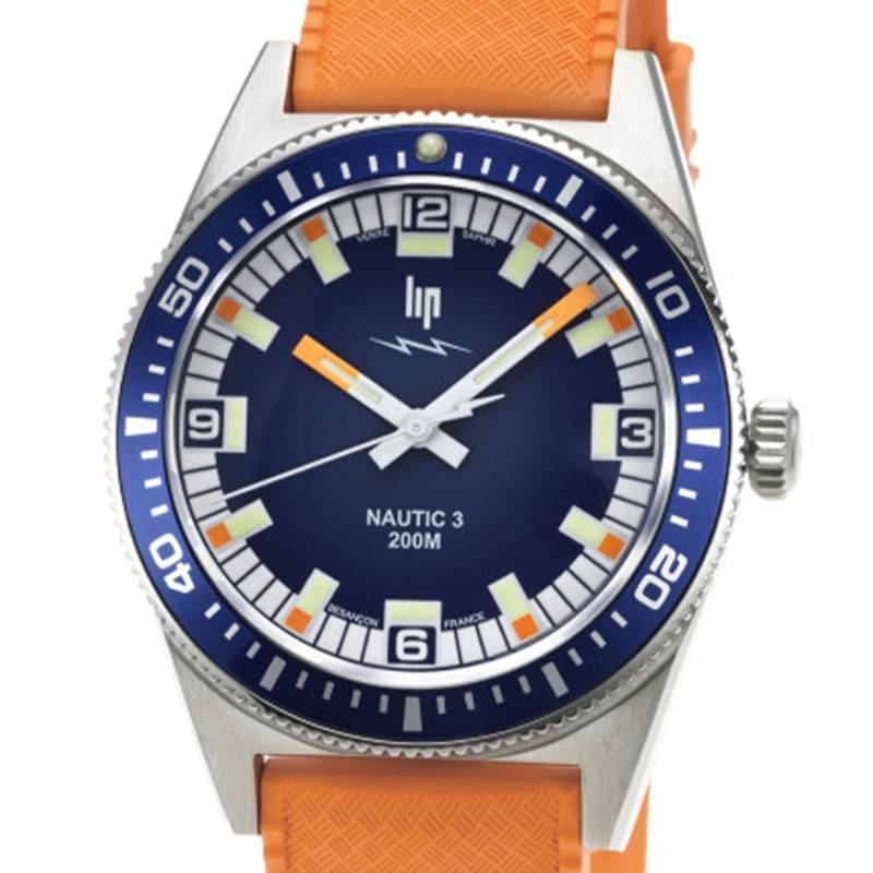 La montre Nautic 3 de chez Lip incarne l'héritage horloger français avec une syntonie parfaite entre style et fonctionnalité. Le boîtier, de forme tonneau, présente un diamètre ajusté de 39 mm, offrant un confort idéal pour une tenue quotidienne aussi bien qu'en pleine action. Fabriqué en acier inoxydable 316L, ce boîtier allie robustesse et esthétisme intemporel grâce à sa finition brossée et polie, conférant à cette montre une allure à la fois classique et moderne. Le fond de la montre, vissé pour assurer une étanchéité optimale, protège avec soin le mouvement en son sein. Une lunette unidirectionnelle, équipée de marqueurs luminescents, apporte non seulement une aide précieuse pour des calculs rapides sous l'eau mais aussi une touche esthétique audacieuse à cette merveille de technicité.