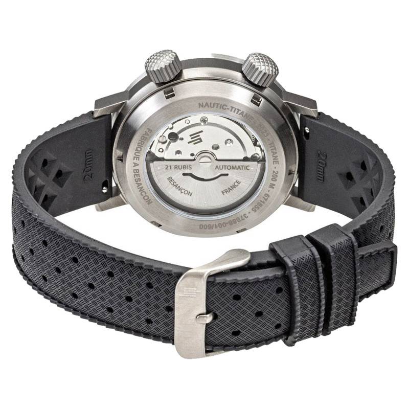 Lip est une marque d'horlogerie française reconnue dans les quatre coins du globe par ses charmantes montres à l'esthétique épurée et à la technicité soignée. Créée par Emmanuel Lipmann en 1867, elle ne cesse de mêler un savoir-faire ancestral, une élégance à la française et des technologies avancées pour présenter des garde-temps précis, intemporels et performants qui accompagnent celles et ceux qui les portent avec détermination et grand style dans toutes les aventures de la vie. Découvrez sans plus attendre sa toute nouvelle montre 671855 en édition limitée à 600 exemplaires qui vous charmera dès les premiers instants en s'imposant avec élégance et modernité sur votre poignet. Destiné pour les poignets masculins, ce modèle fait partie de la collection Nautic-Ski, une ligne de garde-temps robustes, performants et avant-gardistes pensés pour la vie quotidienne ainsi que pour les aventures nautiques. Conjuguant une allure sportive et un design contemporain, il parera toutes vos tenues, de la plus décontractée à la plus habillée, avec raffinement en vous conférant un look distingué au quotidien. Il s'équipe d'un boîtier rond conçu en titane qui se pare d'une finition brossée, rehaussant son aspect sport-chic. Ce dernier mesure 41 mm de diamètre pour convenir à toutes les tailles de poignet en assurant un confort extrême tout au long du port. Un verre saphir de forme plate passe par-dessus le cadran afin d'encaisser tous les chocs et les dommages qui peuvent nuire à son esthétique. Pour régler les heures, les minutes et la date ainsi que manipuler l'anneau interne, deux couronnes crantées à la surface texturée prennent place à 2h et 4h se mettant à votre entière disposition. Grâce à son fond de boîte vissé, cette montre résistera à l'eau jusqu'à une pression atmosphérique de 20 bar. Celui-ci dévoile une ouverture transparente à travers laquelle vous pourrez admirer le mouvement des rouages.