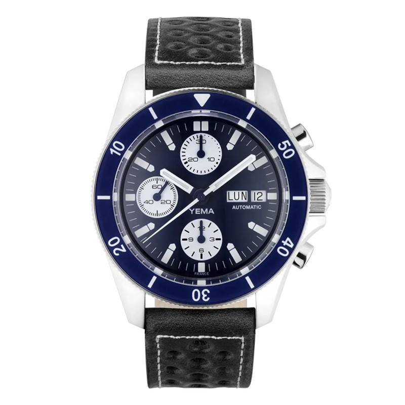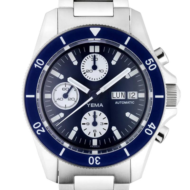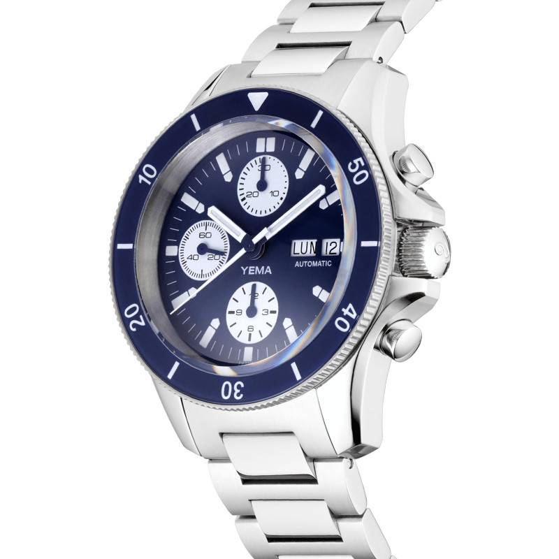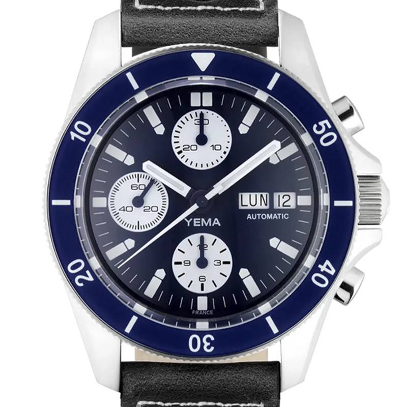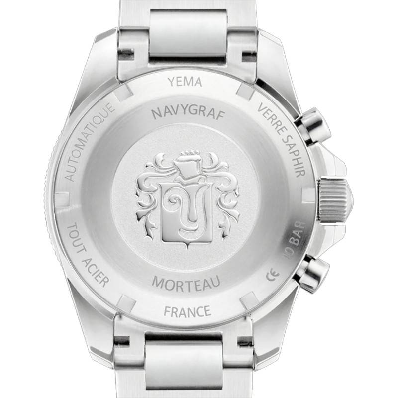 Yema a su marquer l'univers horloger mondial avec ses montres esthétiques. Ses modèles s'inspirent du secteur de l'aviation et sont assemblés avec précision dans les ateliers français par des experts dans le domaine. Yema vous dévoile aujourd'hui cette Navygraf Chrono de référence YNAV22CH.FR. Cette montre arbore un boîtier rond en acier inoxydable 316L d'un effet poli. Son diamètre de 40 millimètres et son épaisseur de 13.9 millimètres en font un garde-temps typiquement adapté aux poignets masculins. Un verre saphir bombé de 1.80 millimètres d'épaisseur est placé sur ce boîtier argenté, il protégera efficacement le cadran contre les rayures et les chocs du quotidien pouvant lui nuire. Ce boîtier se pare d'une lunette saphir bleue bidirectionnelle et cannelée résistante aux rayures. Marquée par des graduations en chiffres arabes allant de 0 à 60, vous pourrez l'utiliser même en milieux obscurs grâce à leur traitement super-lumiNova BGW9 grade A. Deux boutons-poussoirs et une couronne crantée parée par le logo embossé sont présents sur la droite de ce garde-temps. Ceux-ci permettront de mettre en marche et de régler ses différentes fonctionnalités. Sur le fond de boîte vissé, se trouvent certaines fonctions qui caractérisent cette Navygraf. Gravé par le blason historique de la marque à la presse hydraulique, il assure une étanchéité de 10 ATM.
